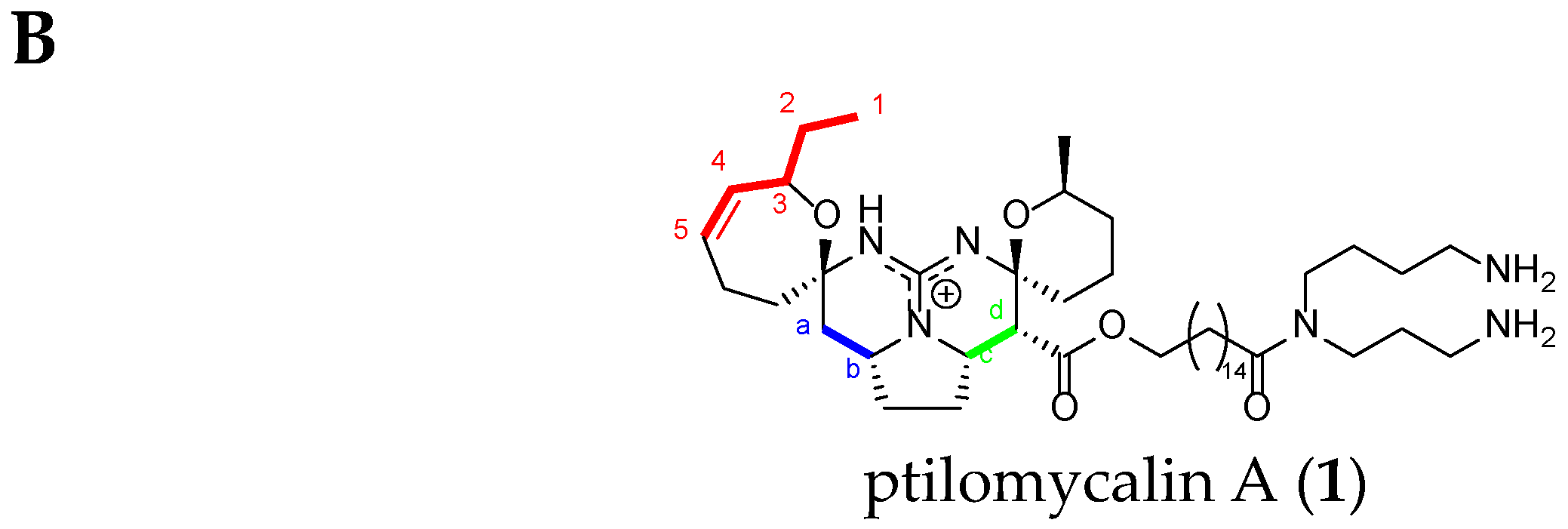 - Kashman, Y.; Hirsh, S.; McConnell, O.J.; Ohtani, I.; Kusumi, T.; Kakisawa, H. Ptilomycalin A: A novel polycyclic guanidine alkaloid of marine origin. J. Am. Chem. Soc. 1989, 111, 8926–8928. [Google Scholar] [CrossRef]