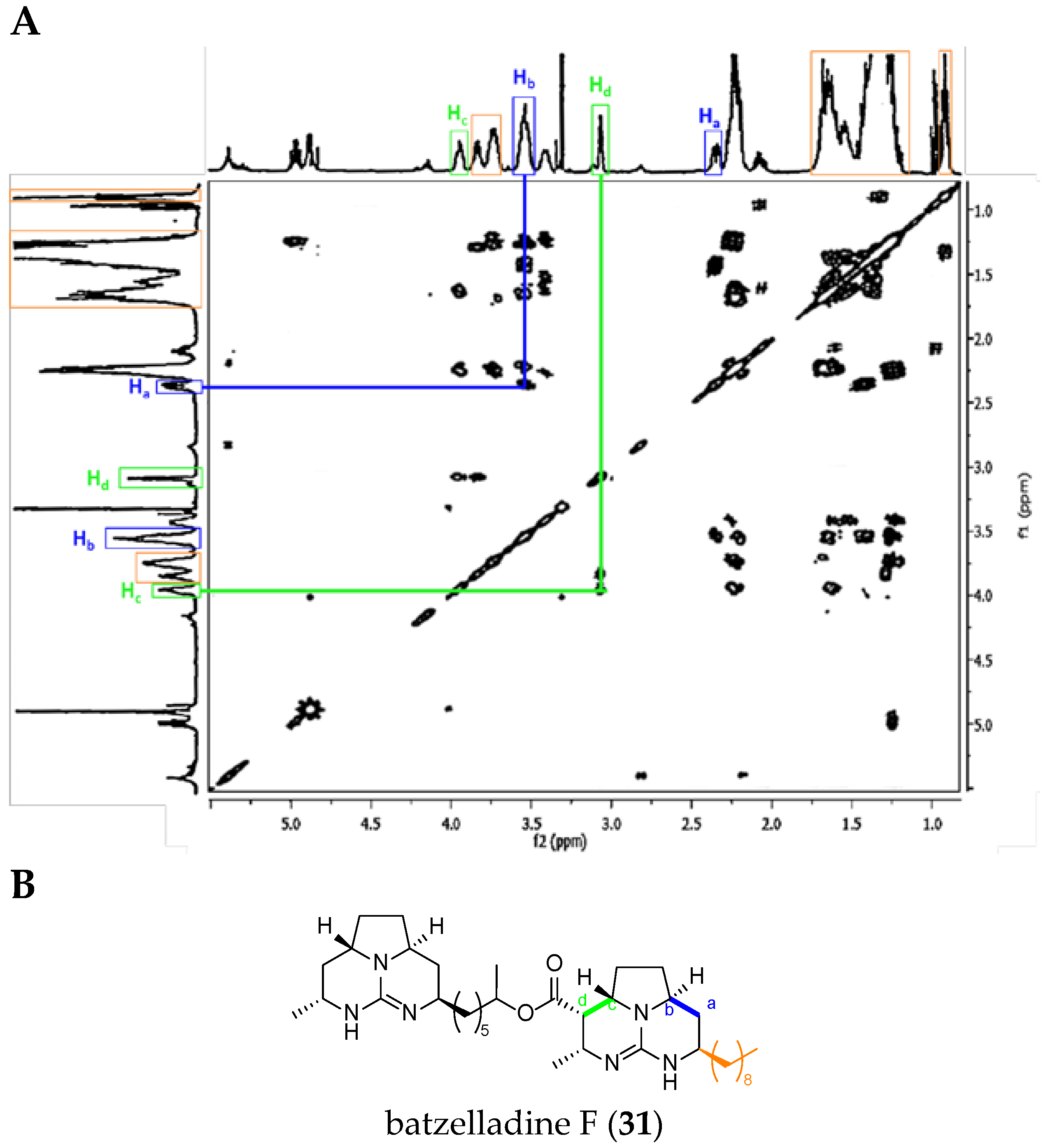 (A) Batzelladine F (31) 1H-1H COSY NMR spectrum in CD3OD (adapted from Patil et al. [67]); and (B) labeled batzelladine F (31).