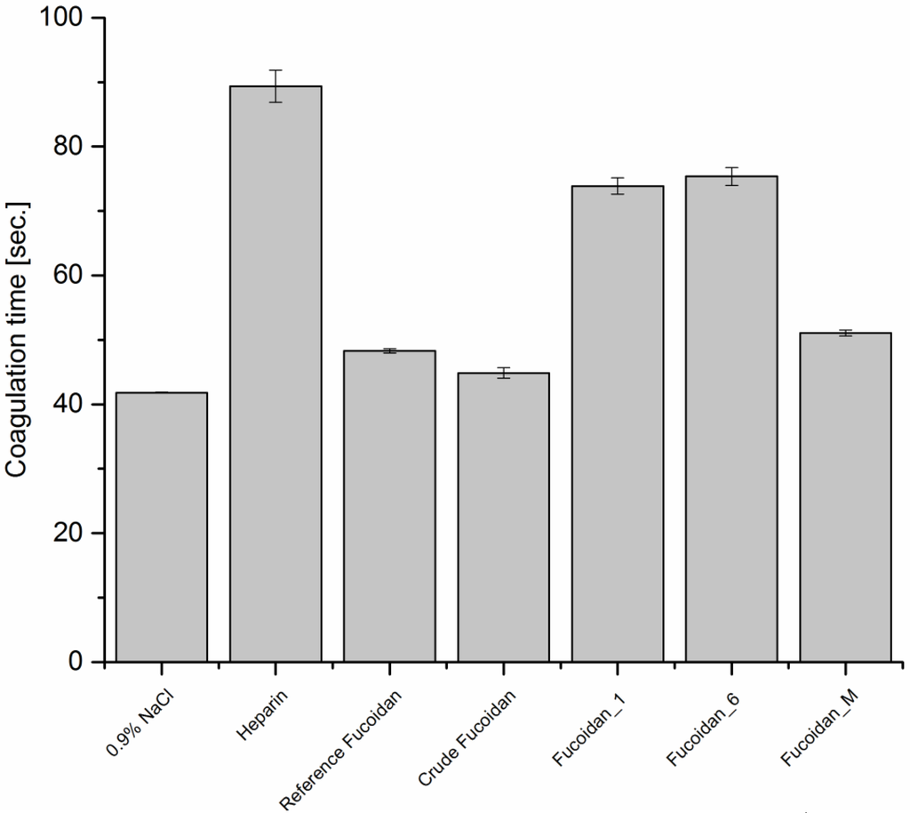 APTT was determined for all fucoidan fractions, according to the protocol described by Anderson et al. [28] with few modifications. All the samples were prepared in an isotonic solution of 0.9% w/v NaCl. The device was programmed to mix 0.6 mL of platelet-poor plasma with 0.3 mL of 10 µg·mL−1 fucoidan solution. Each mixture was then incubated for 60 s at 37 °C before the addition of 0.5 mL pre-warmed APPT reagent and then incubated again for 5 min at 37 °C. Afterwards, 0.6 mL of a pre-warmed 0.25 M CaCl2 solution was added and the time for clot formation was recorded. These steps were repeated three times. Heparin in a concentration of 5 µg·mL−1 and 0.9% w/v NaCl were used as positive and negative control, respectively.