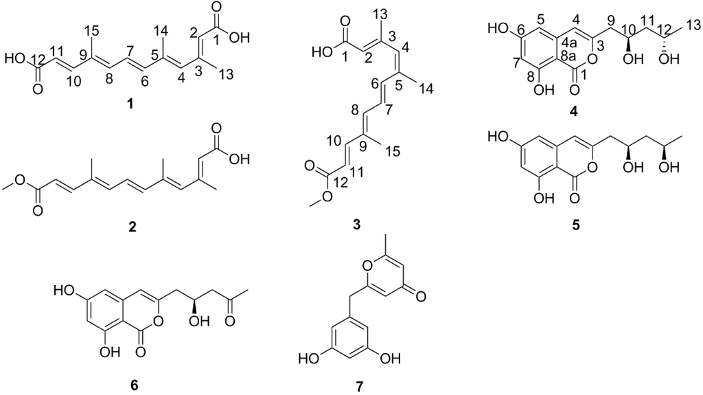 Endophytic fungi can produce a diversity of natural products, which are structurally unique and possess interesting biological and pharmacological properties [4,5]. As part of our ongoing investigation into bioactive metabolites from mangrove endophytic fungi collected from the South China Sea [6,7,8,9,10,11,12], a chemical investigation of the mangrove-derived fungus Nectria sp. HN001, isolated from a fresh branch of the mangrove plant Sonneratia ovata, had led to the isolation and characterization of four new polyketides: nectriacid A (1), nectriacid B (2), nectriacid C (3), and 12-epicitreoisocoumarinol (4), as well as three known compounds: citreoisocoumarinol (5), citreoisocoumarin (6), and macrocarpon C (7) (Figure 1). Previous studies showed that linear polyene derivatives exhibited anti-inflammatory [13], antihypertensive [14], antibacterial [15], and antifungal activities [16]. In this report, compounds (1–7) from the Nectria sp. HN001 were evaluated for α-glucosidase inhibitory activity. The results showed that compounds 2 and 3 exhibited significant inhibitory activity toward α-glucosidase. Here, details of the isolation, structure elucidation, and activity against α-glucosidase of these compounds are described.