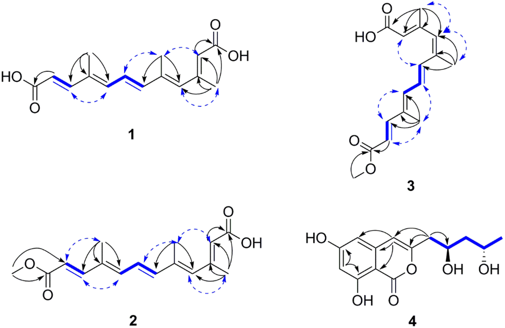 Selected 1H–1H COSY (bold line), HMBC (arrow), and key NOESY (dashed lines) correlations of compounds 1–4.