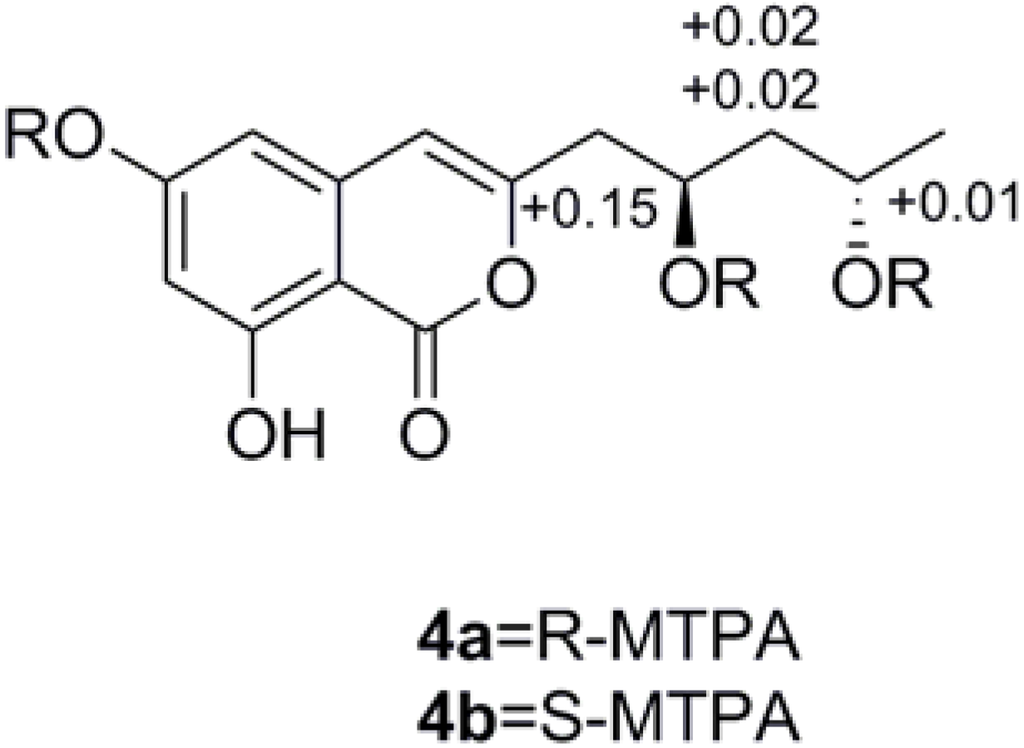 Compound 4 was obtained as colorless powder. Its molecular formula C14H16O6 was deduced by the (−)-HRESIMS m/z 279.0871 [M − H]−, corresponding to seven degrees of unsaturation. The IR spectrum displayed typical absorption bands for hydroxyl (3394 cm−1) and aromatic ring system (1684, 1629, and 1588 cm−1). The 1H NMR spectrum (Table 2) suggested the presence of one methyl group [δH 1.21 (3H, d, J = 6.3 Hz, H-13)], two methylene groups [δH 2.65 (1H, dd, J = 14.5, 4.9 Hz, H-9a), 2.59 (1H, dd, J = 14.5, 8.0 Hz, H-9b); δH 1.60 (1H, ddd, J = 14.3, 10.6, 3.4 Hz, H-11a), 1.55 (1H, ddd, J = 14.3, 10.6, 3.4 Hz, H-11b], two methine groups [δH 4.21 (1H, m, H-10), 4.02 (1H, m, H-12)], and three olefinic protons [δH 6.37 (1H, s, H-4), 6.31 (2H, overlap, H-5, H-7)]. The 13C NMR spectrum of 4 (Table 2) showed 14 carbon resonances, including one methyl (δC 24.5), six quaternary sp2 (δC 168.0, 167.5, 165.0, 156.3, 141.4, 100.0), two methylene sp3 (δC 47.1, 43.1), three methine sp2 (δC 107.2, 103.8, 102.8), and two oxygen-bearing methine sp3 (δC 67.2, 65.4) carbons. Detailed analysis of the 1H and 13C NMR data (Table 2) suggested that 4 belonged to the isocoumarin class, and its NMR data were similar to those of citreoisocoumarinol 5 [19]. Comparison of the NMR data of compounds 4 and 5 suggested that they differed only in the substituents on C-3. The absolute configuration of C-10 and C-12 of compound 4 was determined as 10R, 12S by applying Mosher’s methods to the 1, 3-anti-diol model as reported [20,21,22]. The procedure started with esterification of 4 with the two enantiomers of (R)- or (S)-MTPA chloride (4a = R or 4b = S) [23], and then the differences in chemical shift values (Δδ = δS − δR) for 4b and 4a were calculated to assign the configuration of C-10 and C-12 (Figure 3). So 4 was named 12-epicitreoisocoumarinol.