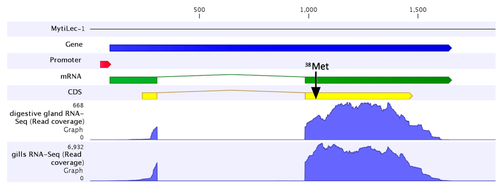 2.3. The MytiLec-1 Gene Comprises Two Exons