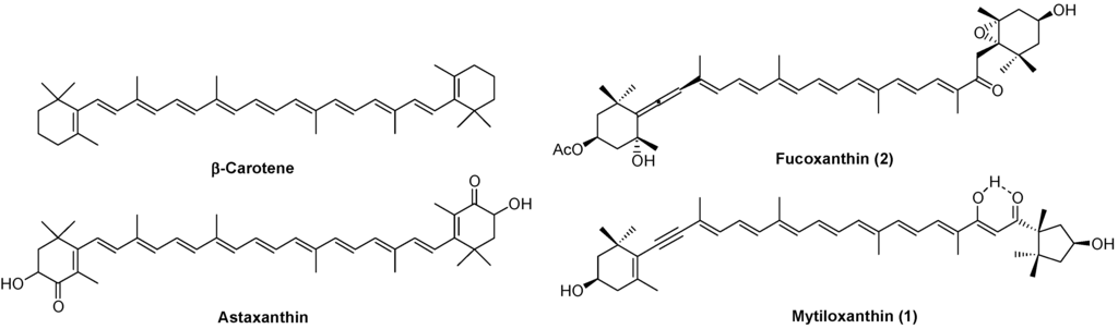 - Khare, A.; Moss, G.P.; Weedon, B.C.L. Mytiloxanthin and isomytiloxanthin, two novel acetylenic carotenoids. Tetrahedron Lett. 1973, 3921–3924. [Google Scholar] [CrossRef]