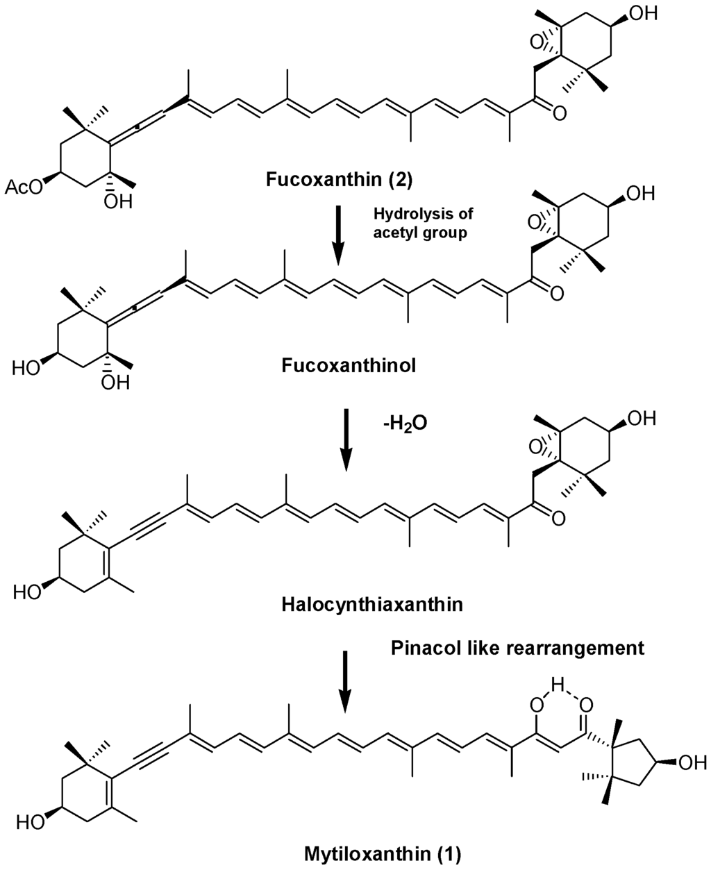 It was reported that mytiloxanthin was converted from fucoxanthin (2) through a pinacol-like rearrangement [,,]. Namely, dietal fucoxanthin (2) from diatoms was a metabolite for mytiloxanthin (1) via fucoxanthinol and halocynthiaxanthin in shellfish and tunicates, as shown in Figure 2 [,,,].