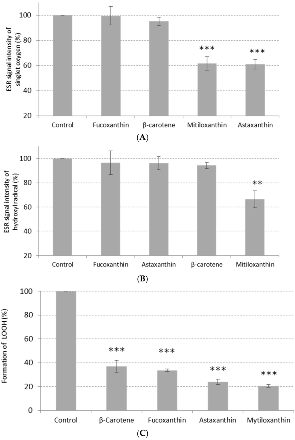 Scavenging activities (% of control group) for singlet oxygen (A) and hydroxyl radicals (B) and inhibitory effect (% of control group) on the lipid peroxidation (C) of carotenoids. Significance compared with the control group: * p < 0.05, ** p < 0.01, *** p < 0.01.