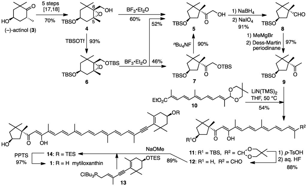Mytiloxanthin (1) was synthesized by a recently reported method [] as shown in Scheme 1. The anti(α)-epoxy alcohol 4, stereoselectively prepared from (–)-actinol (3) [,], was treated with BF3·OEt2 to provide the cyclopentyl ketone 5 in 60% yield, by opening of C-6-oxygen bond of the oxirane ring and subsequent ring contraction. The yield of 5 from 4 was improved by a stepwise route through the di-tert-butyldimethylsilyl (TBS) ether 6 (86% for 3 steps). The compound 5 was converted into the methyl ketone 9 in four steps and this was condensed with the separately prepared conjugated ester 10 to give the desired β-diketone 11. After hydrolysis of acetal moiety of 11 and subsequent desilylation, the resulting apocarotenal 12 [] was condensed with the acetylenic phosphonium salt 13 [] and then desilylated to preferentially provide all-E-mytiloxanthin (1) in a good yield. The total yield of 1 from epoxy alcohol 4 was 30% over 13 steps (21% from (–)-actinol over 18 steps).