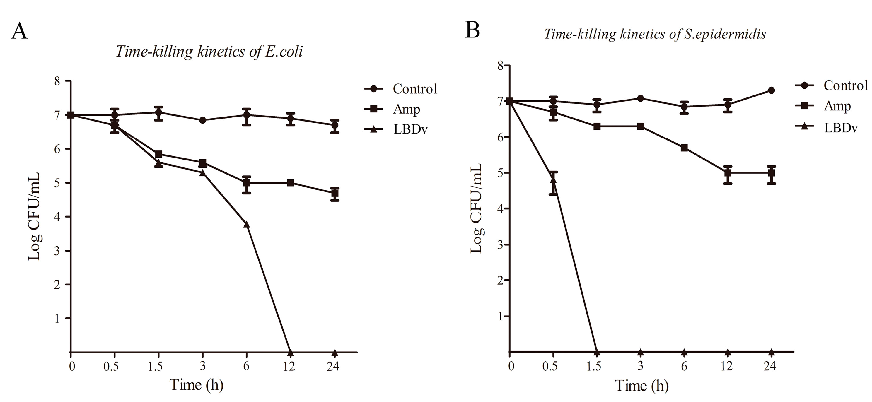 The time-killing curves of LBDv against Escherichia coli and Staphylococcus epidermidis are shown in Figure 1. After incubation with 64 μM of LBDv, E. coli is completely killed within 12 h, and S. epidermidis is killed within 1.5 h. Compared to ampicillin, 64 μM LBDv could kill the target bacteria in much shorter time than ampicillin with same concentration.