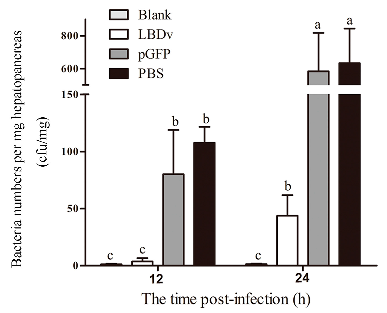 The colony numbers of Vibrio harveyi in the hepatopancreas of shrimp at 12 h and 24 h after injection are shown in Figure 2. The colony numbers of V. harveyi in the hepatopancreas of shrimp from LBDv peptide group are significantly lower (p < 0.05) than those in pGFP and PBS group at both 12 h and 24 h after injection.