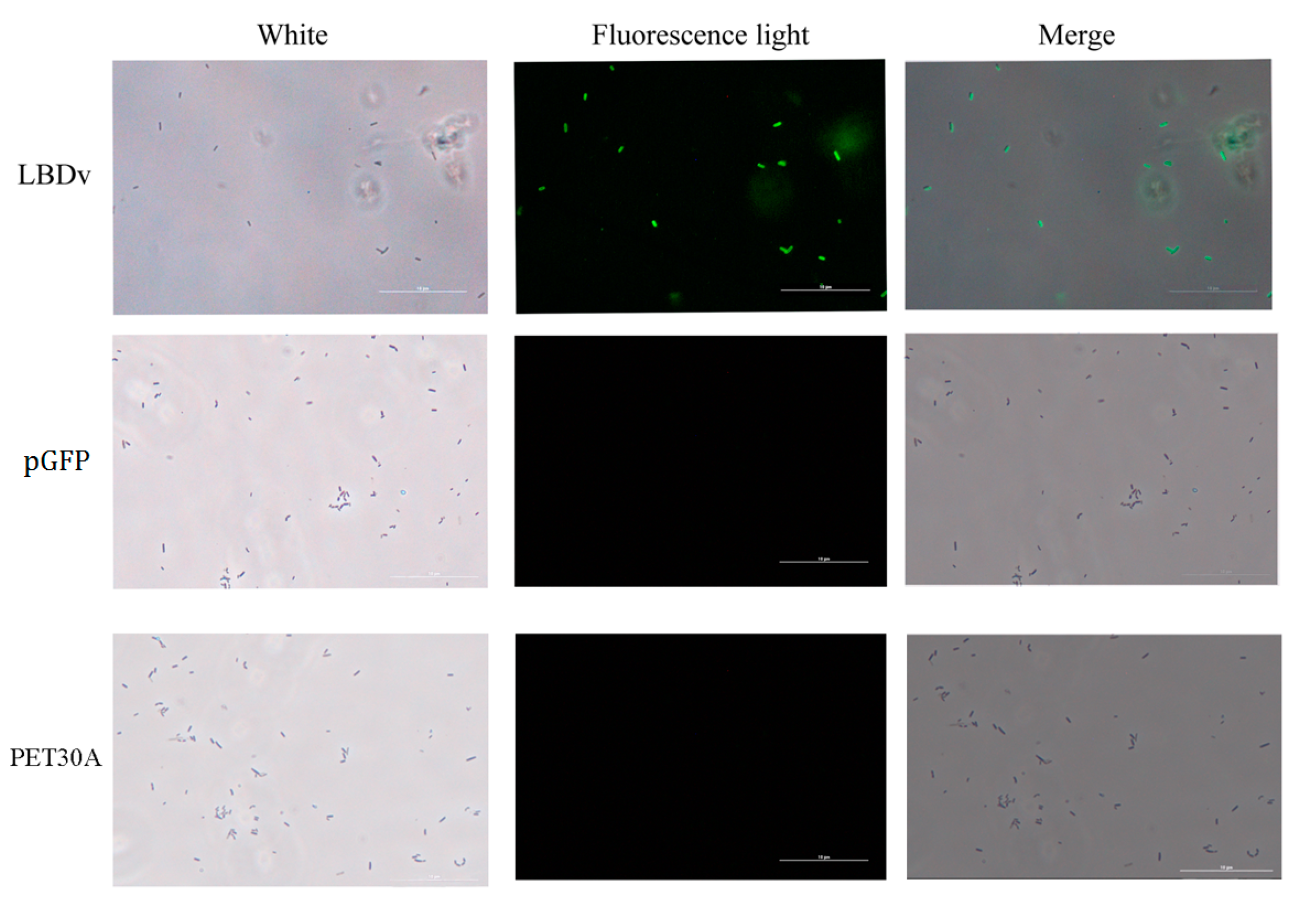 The binding detection of LBDv-His peptide to E. coli is shown in Figure 3. Compared with the control, apparent fluorescence is observed for E. coli after incubation with the LBDv-His peptide, whereas no fluorescence is detected in the controls (pGFP and PET30A treatments).