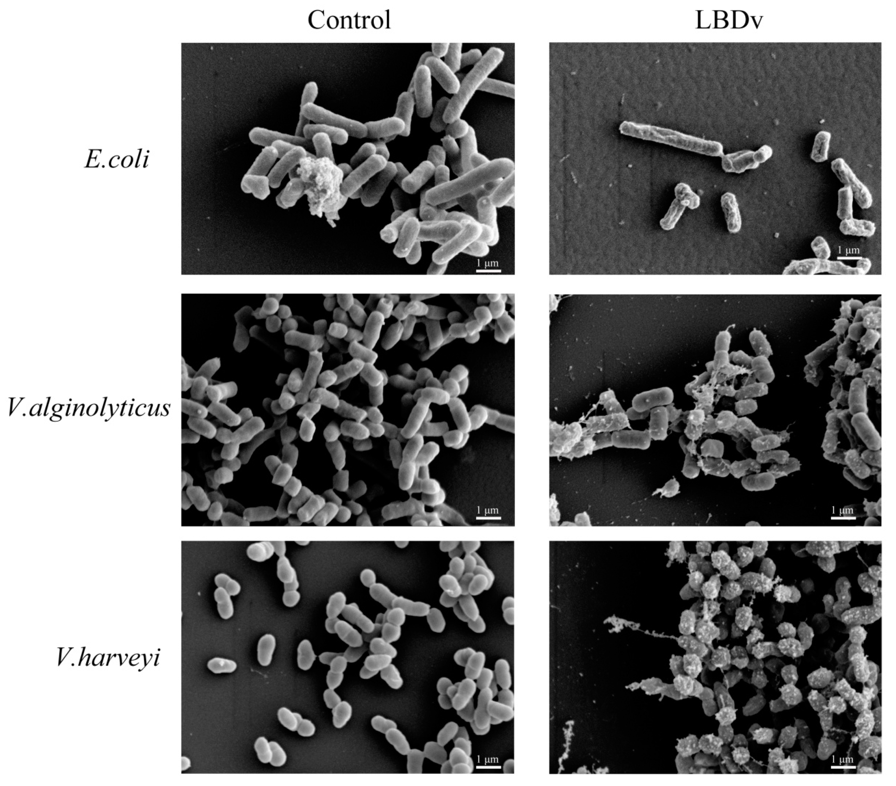 Morphology of the bacteria after treatments by LBDv peptide. The 108 cfu/mL different bacteria are incubated with 64 μM LBDv peptide for 2 h. The bacteria treated with same concentration pGFP peptide are used as control. Scale bar is 1 μm.