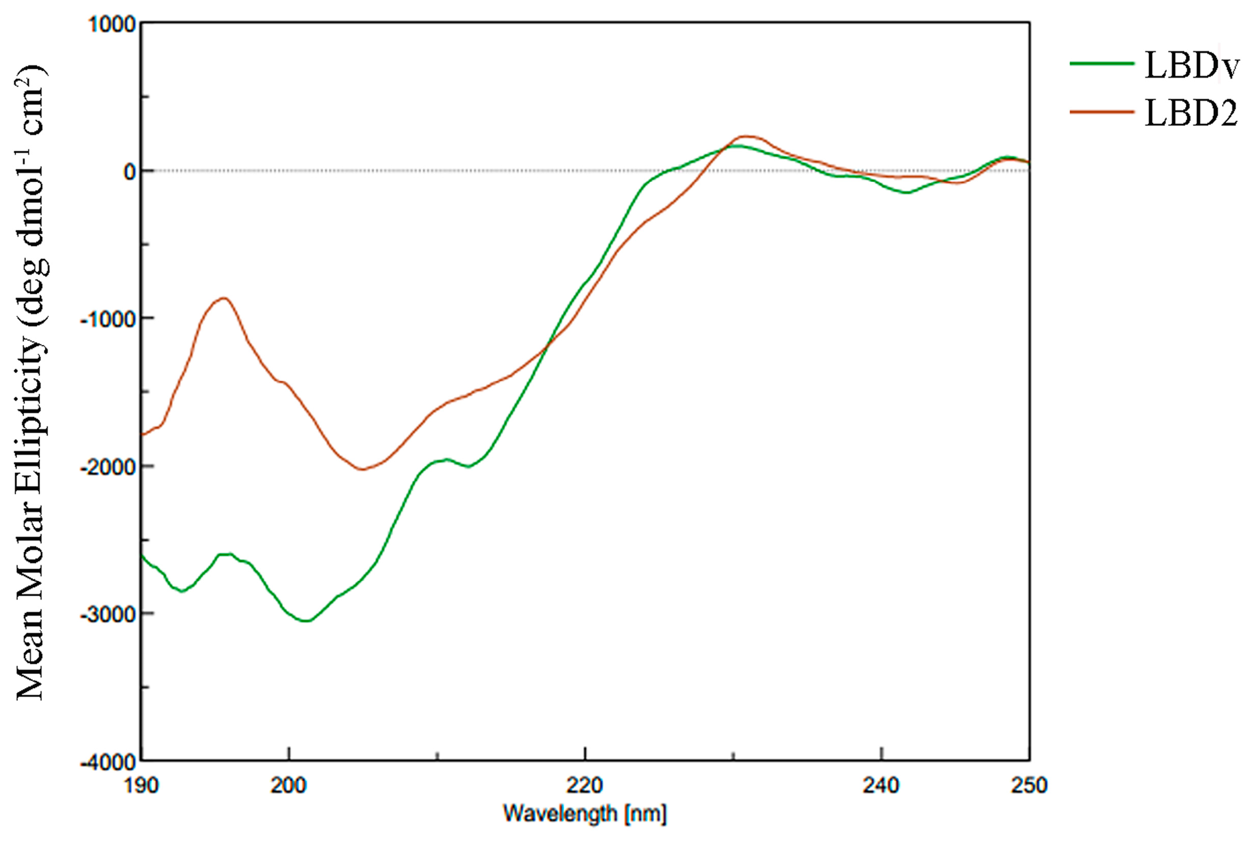 The secondary structure content of LBD2 and LBDv were measured by circular dichroism spectroscopy (JASCO 715, Tokyo, Japan) in far UV. Spectra were recorded at room temperature, over the range of 190 to 250 nm. The peptide concentration was 0.2 mg/mL in 20 mM phosphate buffer pH 7.0. We used a scan speed of 50 nm/min, a 0.1 cm cell path length, a response time of 4 s and a band width of 1 nm. A blank spectrum containing all components except the peptide was subtracted from individual spectra to account for the baseline. Finally, the data were smoothed using Jwstda32 software. The acquired CD spectra were then converted to the mean molar ellipticity (deg·dmol−1·cm2). The secondary structural elements of the peptides, including α helix, β-sheet, β-turn and random coil, were calculated based on the CD spectra using Protein SSE software according to a standard reference spectrum.