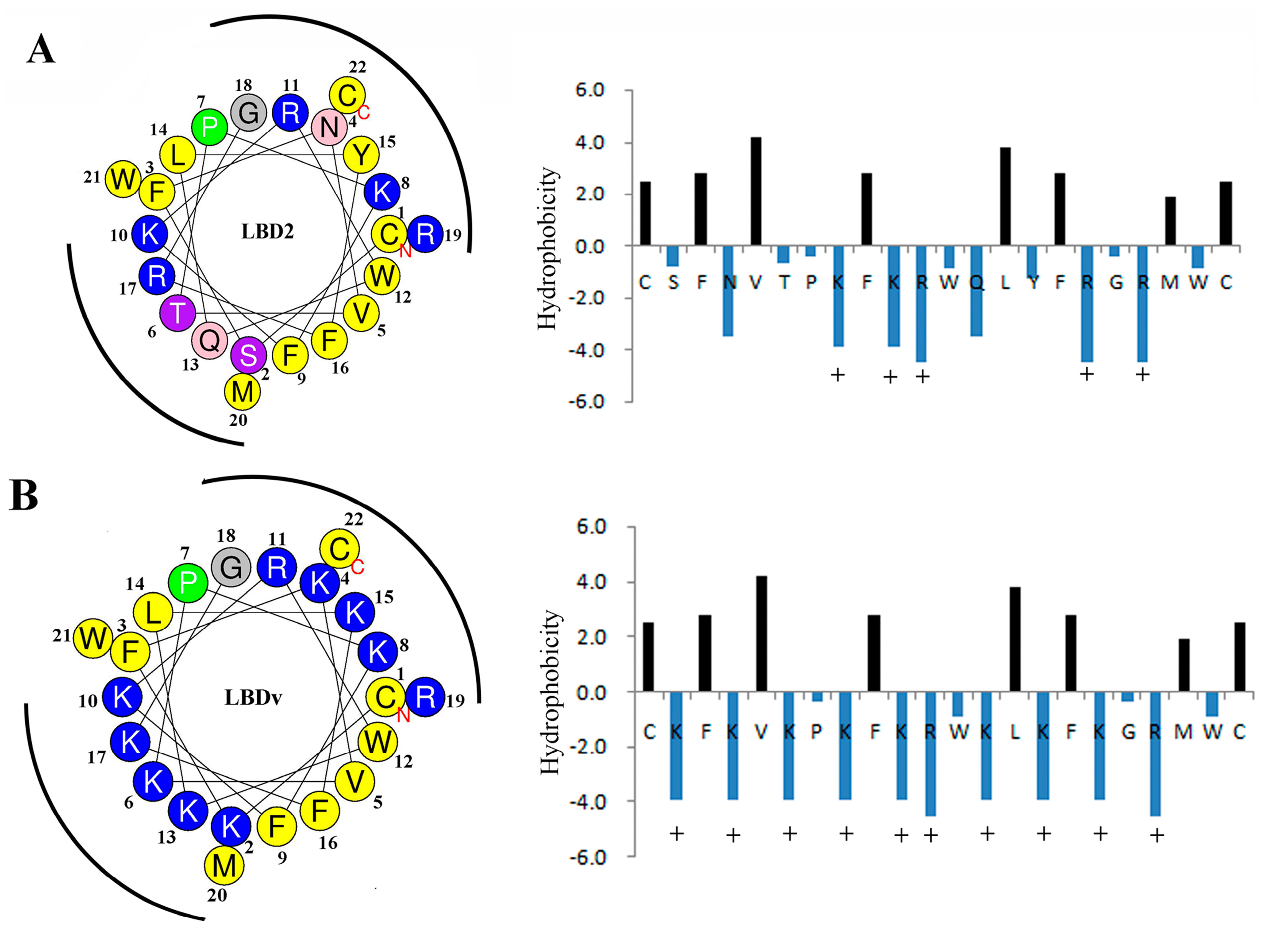 The physicochemical properties and amphipathic characters of LBDv and LBD2 are further analyzed by ProtParam tool and HeliQuest analysis. The wheel diagram and β-strand diagrams (Figure 7) show that the positively charged hydrophilic amino acid residues of LBDv are located on two sides, whereas the hydrophobic residues are on the other two sides, presenting a perfect amphipathic structure for both LBD2 peptide and LBDv. The physiochemical parameters of LBD2 and LBDv are shown in Table 3. The positive net charge and hydrophilicity of LBDv are significantly higher than those of LBD2 peptide.