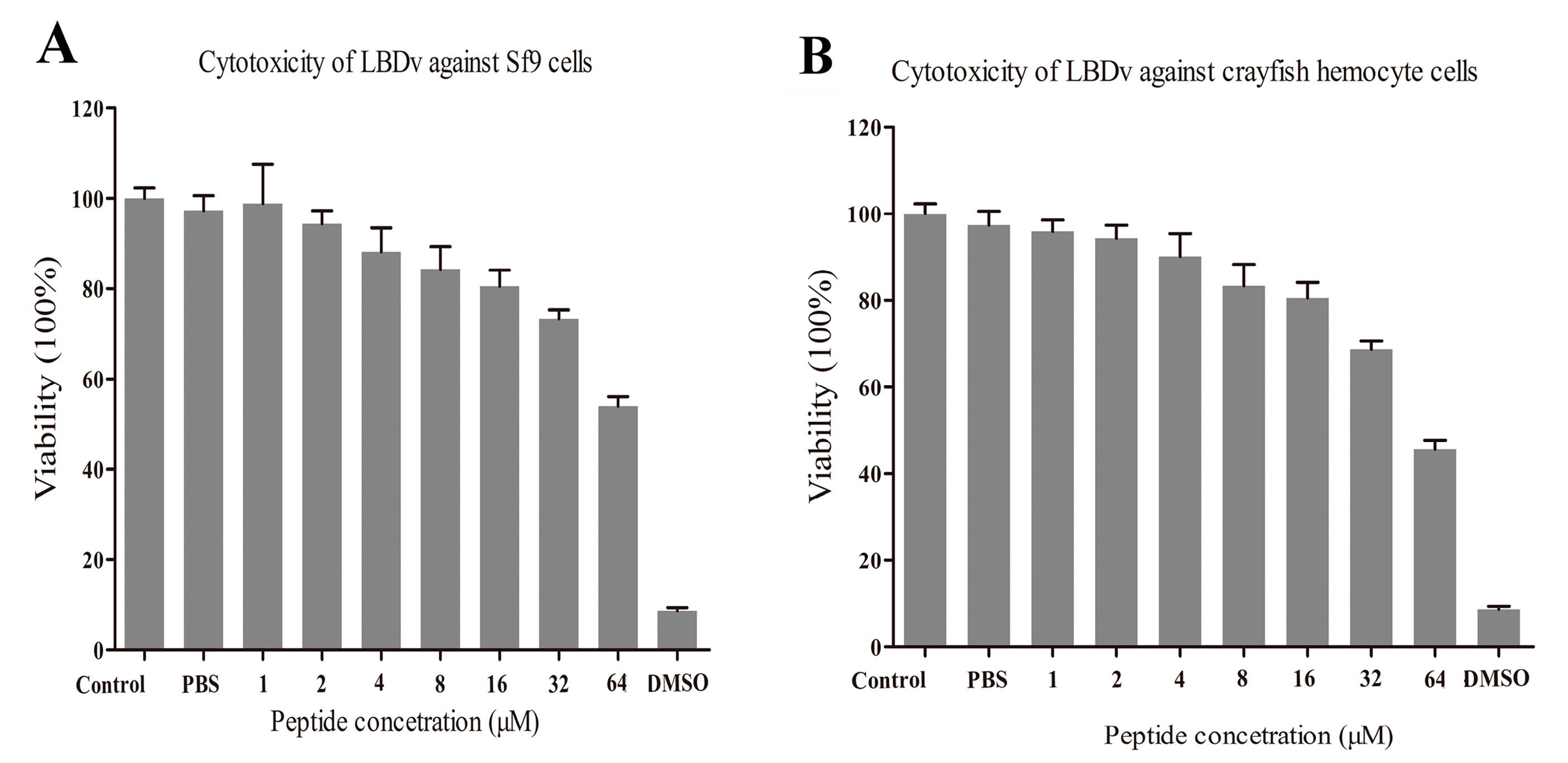 Sf9 cells and primary cultured cells of Cherax quadricarinatus hemocytesare used for the cytotoxicity detection and the cell viability is detected after addition of different concentration of peptides. From the results (shown in Figure 8), more than 80% of Sf9 cells and C. quadricarinatus hemocytes could survive in the LBDv solution with a concentration up to 16 μM. High concentration LBDv peptides solution has toxic effects on both Sf9 cells and hemocytes. Above 32 μM, LBDv exhibits significant toxicity on both cells (with mortalities of ~30% at 32 μM and ~50% at 64 μM).