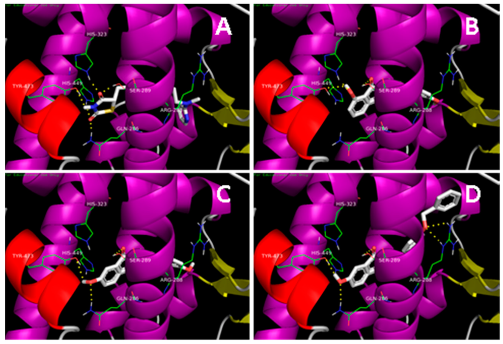 In our previous study, a series of N-substituted phthalimide derivatives, including PD1–PD4, were synthesized based on the potential pharmacophore of paecilocin A, and PD1 was proposed as an interesting lead [14]. Further docking analysis of derivatives (PD5 and PD6) hydroxylated at C-4 showed that they both bind to LBD of PPAR-γ and form H-bonds with key amino acid residues (Figure 2). In particular, docking analysis showed PD6 forms H-bonds with Tyr473, Ser289, and Gln286 in the PPAR-γ binding pocket with higher binding affinity than PD1. Therefore, PD5 and PD6 were synthesized as potential PPAR-γ agonists and compared with PD1–PD4.