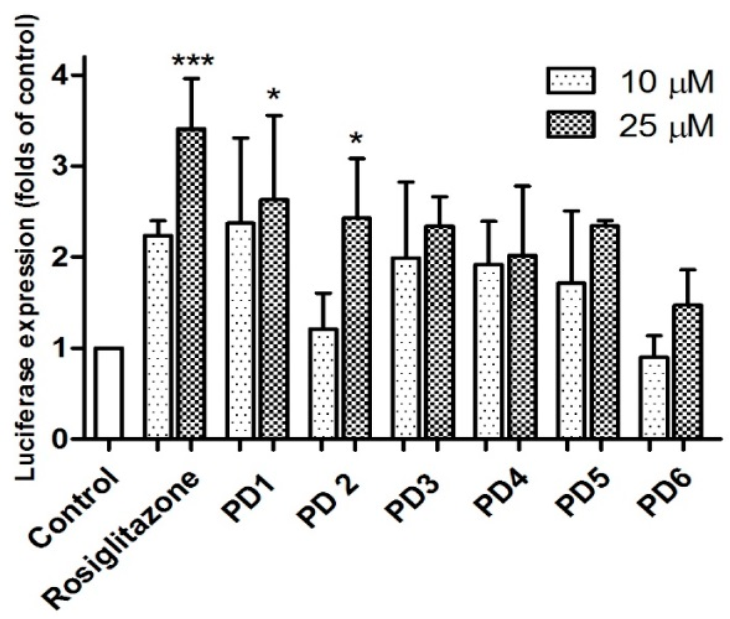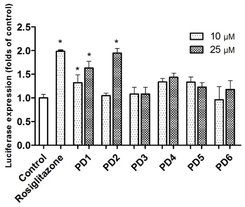 Analogues PD1–PD6 were further evaluated for PPAR-γ activation using human liver HepG2 cells at concentrations of 10 and 25 μM (Figure 4). PD1 and PD2 induced significant PPAR-γ activation at 25 μM. Although PD1~PD6 were not as potent as rosiglitazone in HepG2 or Ac2F cells, PD1 consistently significantly activated PPAR-γ in both cell lines.