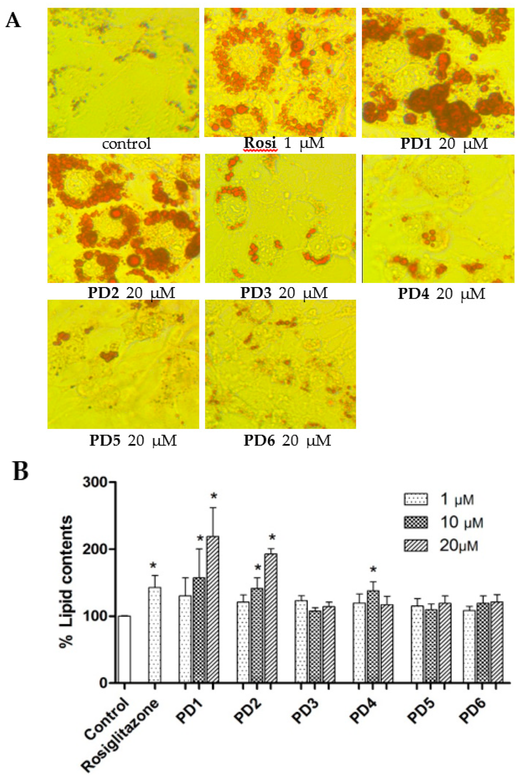 Effects of PD1–PD6 on adipocyte differentiation of 3T3-L1 cells. The 3T3-L1 cells were exposed to 10% FBS/DMEM containing 10 μg/mL insulin and 1 μM dexamethasone in the presence of various concentrations (1, 10, or 20 μΜ) of PD1–PD6 or rosiglitazone (1 μΜ). After eight days, treated cells were stained with Oil red O for morphological assessment by microscopy (A) and lipid contents was determined using an iMark Microplate Absorbance Reader (B). The results shown are representative of three independent experiments, and are presented as means ± SDs (n = 3). * p < 0.05 versus untreated controls.