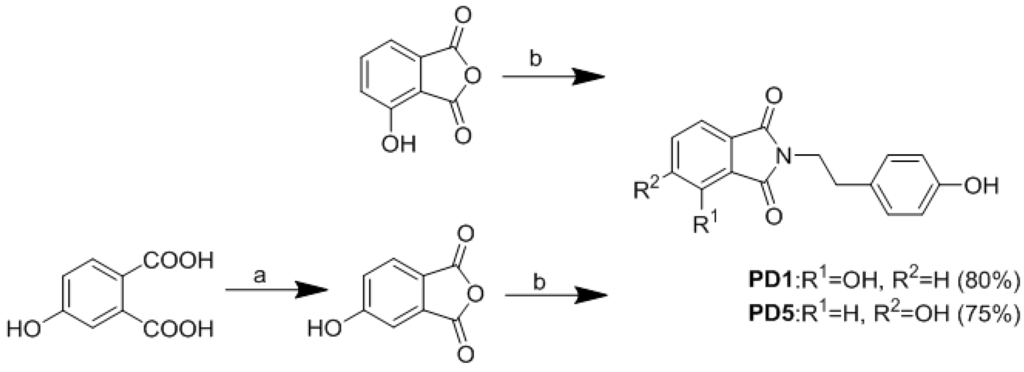 Synthesis of phthalimide derivatives. Reagents and conditions: (a) Ac2O, pyridine, rt, 12 h; (b) tyramine, aqueous CH3COOH, reflux 85 °C, overnight.