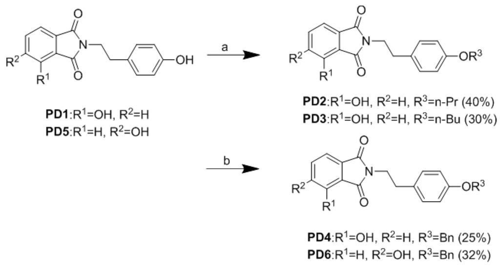 To a solution of 3-hydroxy-N-(p-hydroxy-phenethyl)phthalimide PD1 (13 mg, 0.046 mM) in CH3CN (1.5 mL), RI (CH3(CH2)2I: 9 μL, ca. 0.09 mM; CH3(CH2)3I: 10 μL, ca. 0.09 mM) and Ag2O (10 mg, 0.04 mM) were added. The mixture was then heated under reflux with stirring for 12 h. Solid material was removed by filtration and solvent by evaporation. The solid material so obtained was purified by RP-HPLC using 90% aqueous MeOH as eluent to give PD2 and PD3.