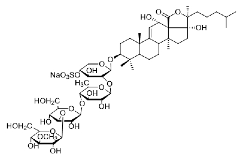 Echinoside A was isolated and identified by our research group. Its mass spectrum (MS) and nuclear magnetic resonance (NMR) data are shown in Figure 1 and Table 1 and Table 2. This is the first characterization of this saponin in Apostichopus japonicas.