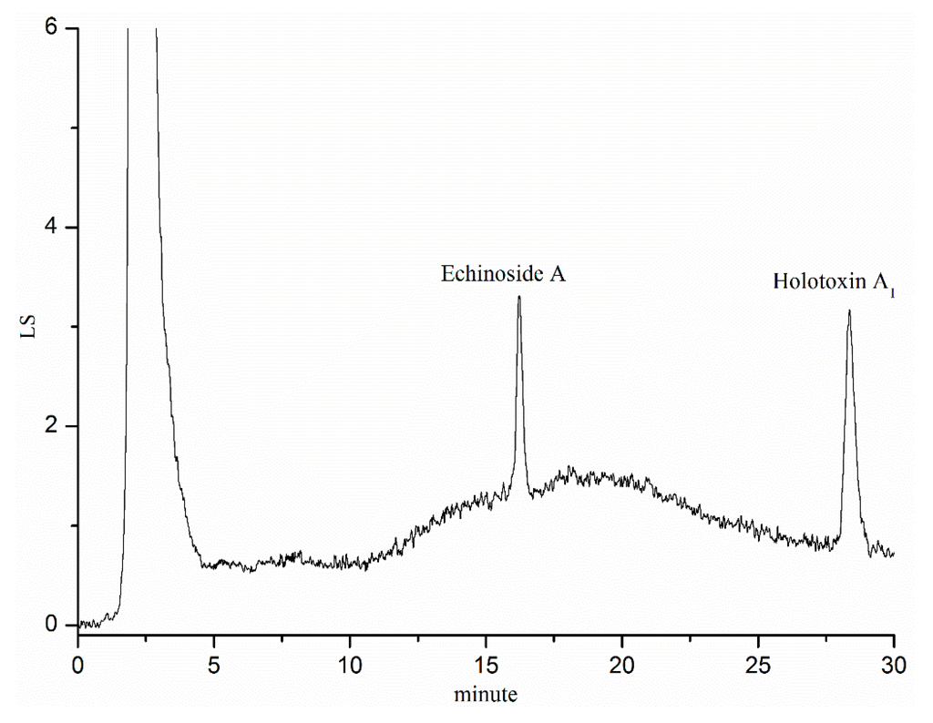 The retention times for Echinoside A and Holotoxin A1 were 16.2 and 28.3 min, respectively (Figure 4).