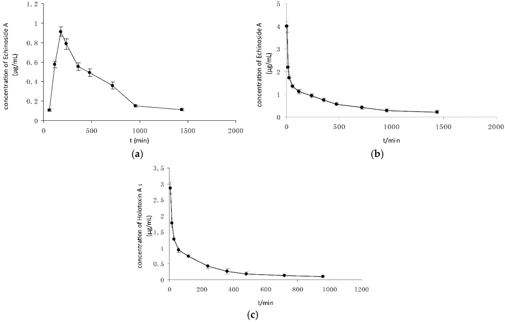 (a) Plasma concentrations-time curves of Echinoside A after oral administration; (b) plasma concentrations-time curves of Echinoside A after intravenous administration; and (c) plasma concentrations-time curves of Holotoxin A1 after intravenous administration. (means ± SD, n = 5).
