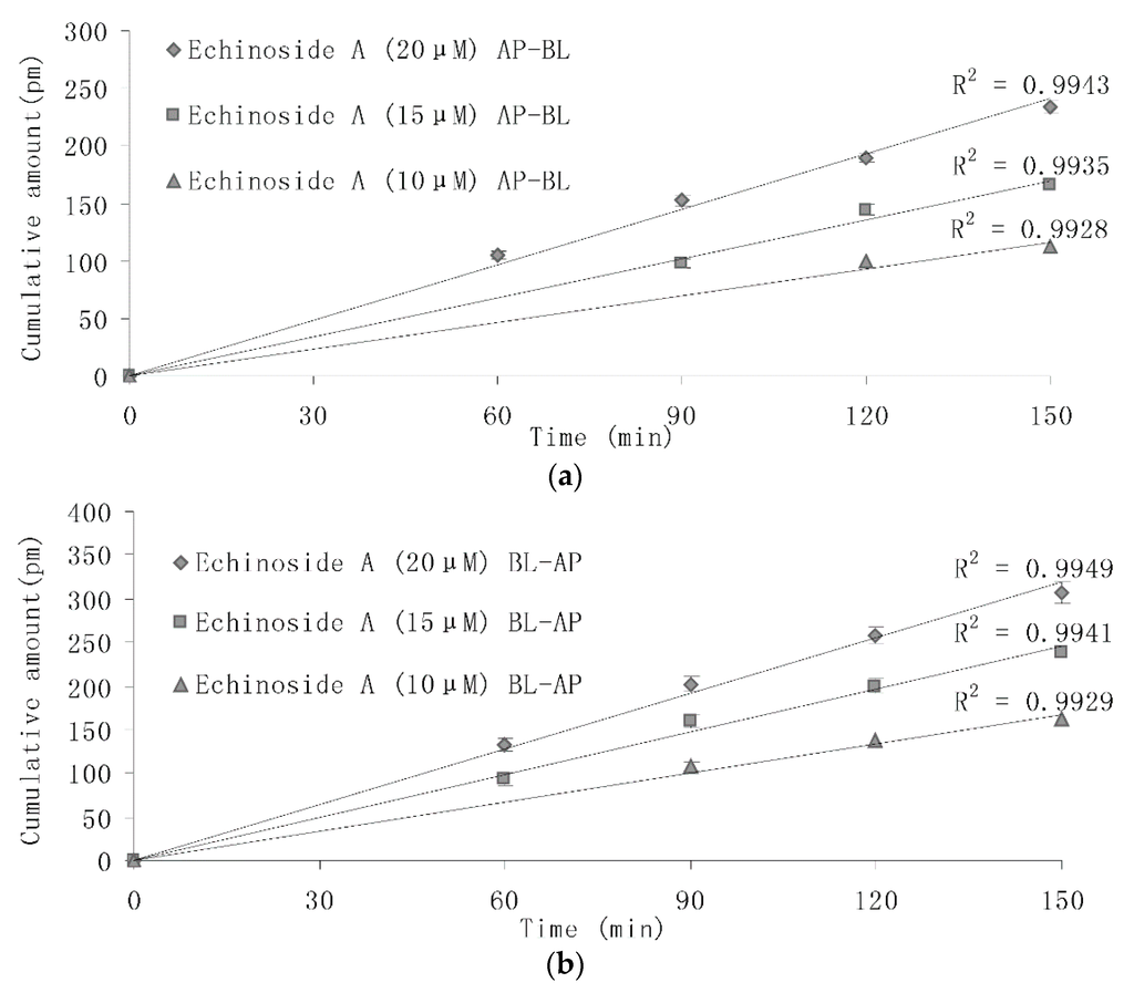 (a) AP-to-BL transport of different concentration of Echinoside A across Caco-2 monolayers; and (b) BL-to-AP transport of different concentration of Echinoside A across Caco-2 monolayers, (means ± SD, n = 3).