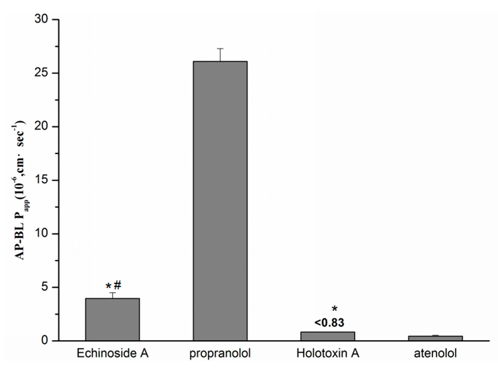 The absorption and transport of the drug in Caco-2 cell monolayer was evaluated by the apparent permeability coefficients (Papp). The PappAB (Papp (AP to BL) value) of Echinoside A (20 µM), Holotoxin A1 (20 µM) and two transcellular transport markers propranolol and atenolol are summarized in Figure 7. Figure 7 indicated that the PappAB of Echinoside A was significantly higher (p < 0.05) than atenolol, and significantly lower (p < 0.05) than propranolol. The PappAB of Holotoxin A1 was significantly lower (p < 0.05) than propranolol and Echinoside A.