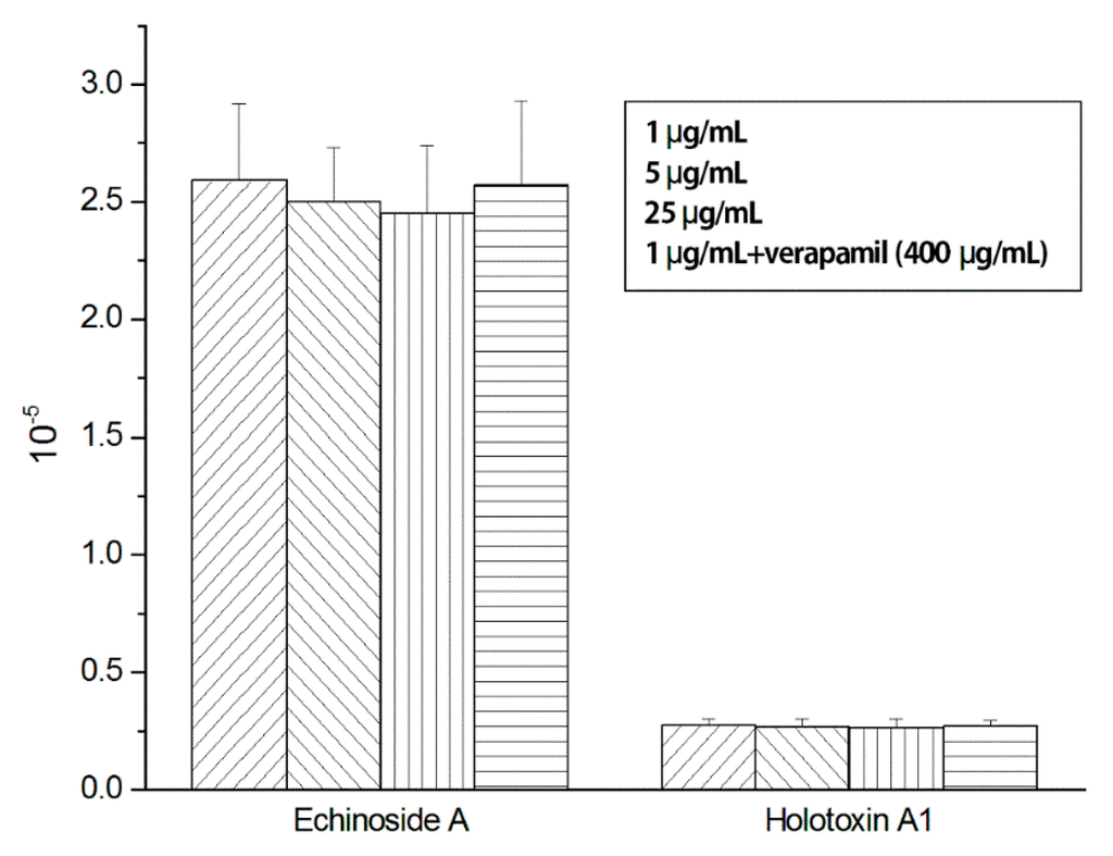 Concentration-dependent changes of Echinoside A and Holotoxin A1 in permeability were not found in the segment of intestine. The permeability at 25 μg/mL of Echinoside A was close to that at 1 μg/mL. No significant increase in permeability of Echinoside A and Holotoxin A1 was tested when verapamil (400 μg/mL) was added to the perfusate, which indicated that P-gp did not affect the intestinal absorption of Echinoside A and Holotoxin A1.