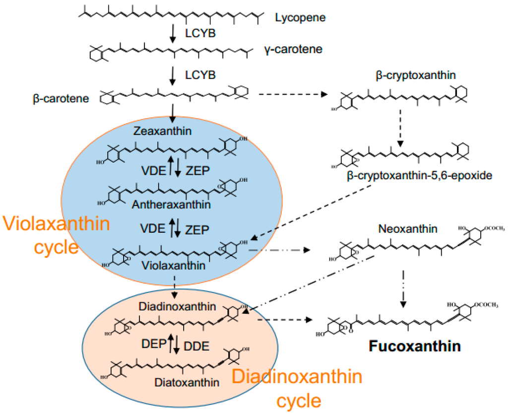 Figure 1. Proposed fucoxanthin biosynthetic steps in diatoms. LCYB: lycopene β-cyclase; VDE: violaxanthin de-epoxidases; ZEP: zeaxanthin epoxidases; DEP: diatoxanthin epoxidases; DDE: diadinoxanthin de-epoxidases. Solid arrows indicate steps that have been validated, while dotted arrows designate the steps to be defined.