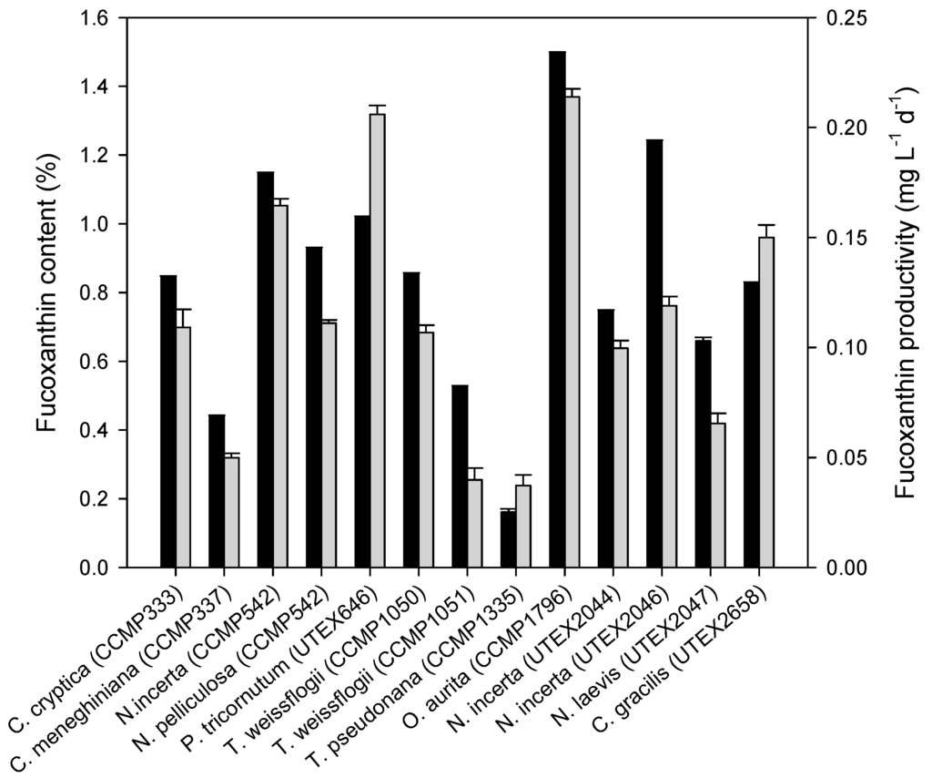 Figure 2. Fucoxanthin content and productivity of thirteen diatom strains under photoautotrophic conditions. Cells on Day 14 were harvested for analysis. Dark bars represent the fucoxanthin content and grey ones represent the fucoxanthin productivity. The fucoxanthin productivity was expressed as fucoxanthin yield divided by culture days. Data are means of three replicates and error bars indicate standard deviations.