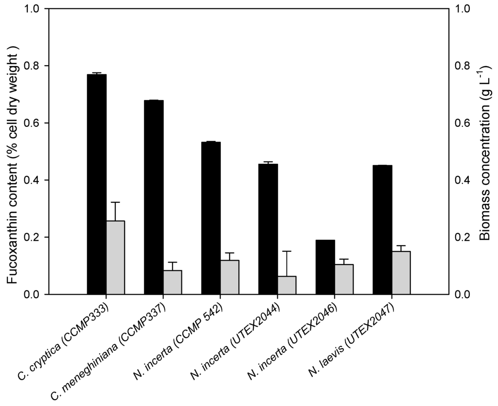 Figure 3. Fucoxanthin content (black column) and biomass concentration (gray column) of diatom strains capable of growing on glucose without light. Cells on Day 6 were collected for analysis. The solid black bar and grey bar represent the fucoxanthin content and biomass concentration, respectively. Data are means of three replicates and error bars indicate standard deviations.