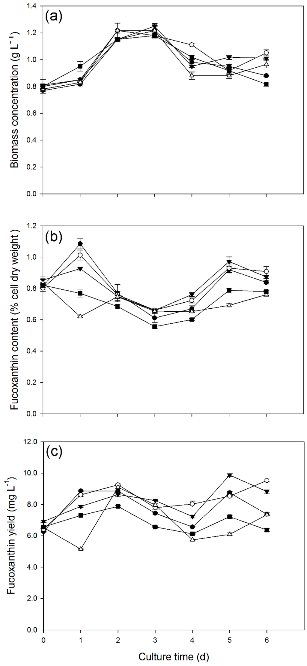 Figure 5. Biomass concentration (a); Fucoxanthin contents (b); and Fucoxanthin yield (c) under different light intensity. Solid circle, empty cycle, solid triangle down and empty triangle up represent an illumination intensity condition of 10, 20, 30, and 40 μmol·m−2·s−1, respectively, with solid square as the dark-growing control. Data are means of three replicates and error bars indicate standard deviations.