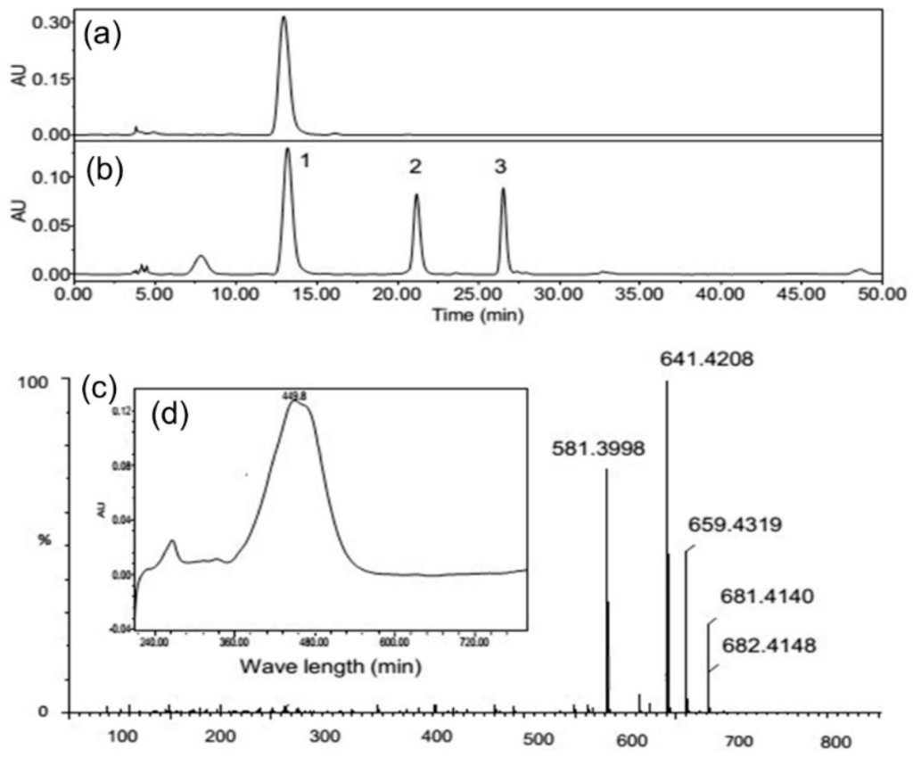 Figure 6. HPLC (High Performance Liquid Chromatography) chromatograms of fucoxanthin standard (a) and the crude extract of C. cryptica (b). Mass spectroscopy (c) of peak 1 in (b) and its visible absorption spectra (d). Absorbance in (a) and (b) was recorded at 449 nm. Peaks were identified as follows: 1, fucoxanthin; 2, diadinoxanthin; and 3, diatoxanthin.