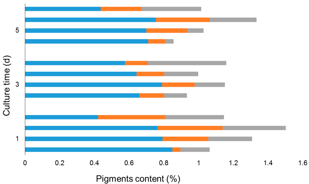 For the screening experiment, all these strains were cultivated in 250 mL Erlenmeyer flasks containing 50 mL of sterile F/2 medium (recipe from NCMA) under an illumination intensity of 30 μmol·m−2·s−1 till the exponential stage. Alga cells were then inoculated at 10% (v/v) into 1000 mL conical flasks containing 400 mL of the same medium with a salinity of 27.5‰ and grown at 25 °C for 14 days. For photoautotrophic cultures, the illumination intensity was 30 μmol·m−2·s−1 with a light/dark regime of 12 h/12 h. For heterotrophic cultures, ten grams of glucose were added per liter of medium. All medium was sterilized at 121 °C for 20 min. Alga cells were harvested through centrifugation and then freeze-dried for 48 h before being used to extract pigments.