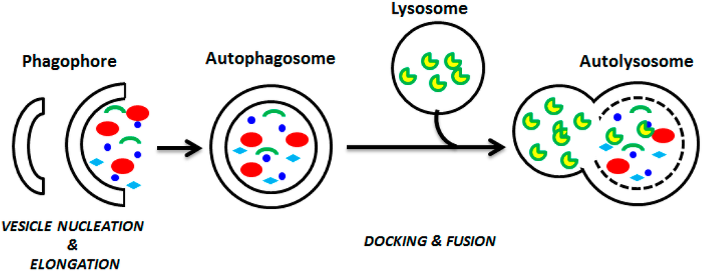 Schematic diagram of the steps of autophagy. Autophagy begins with the formation of the phagophore (vesicle nucleation step), which leads to the expansion of the phagophore into an autophagosome (vesicle elongation) with the helping of specific proteins. The autophagosome contains some different damaged organelles (shown by different colors), which can fuse with a lysosome (docking and fusion steps) forming an autolysosome.