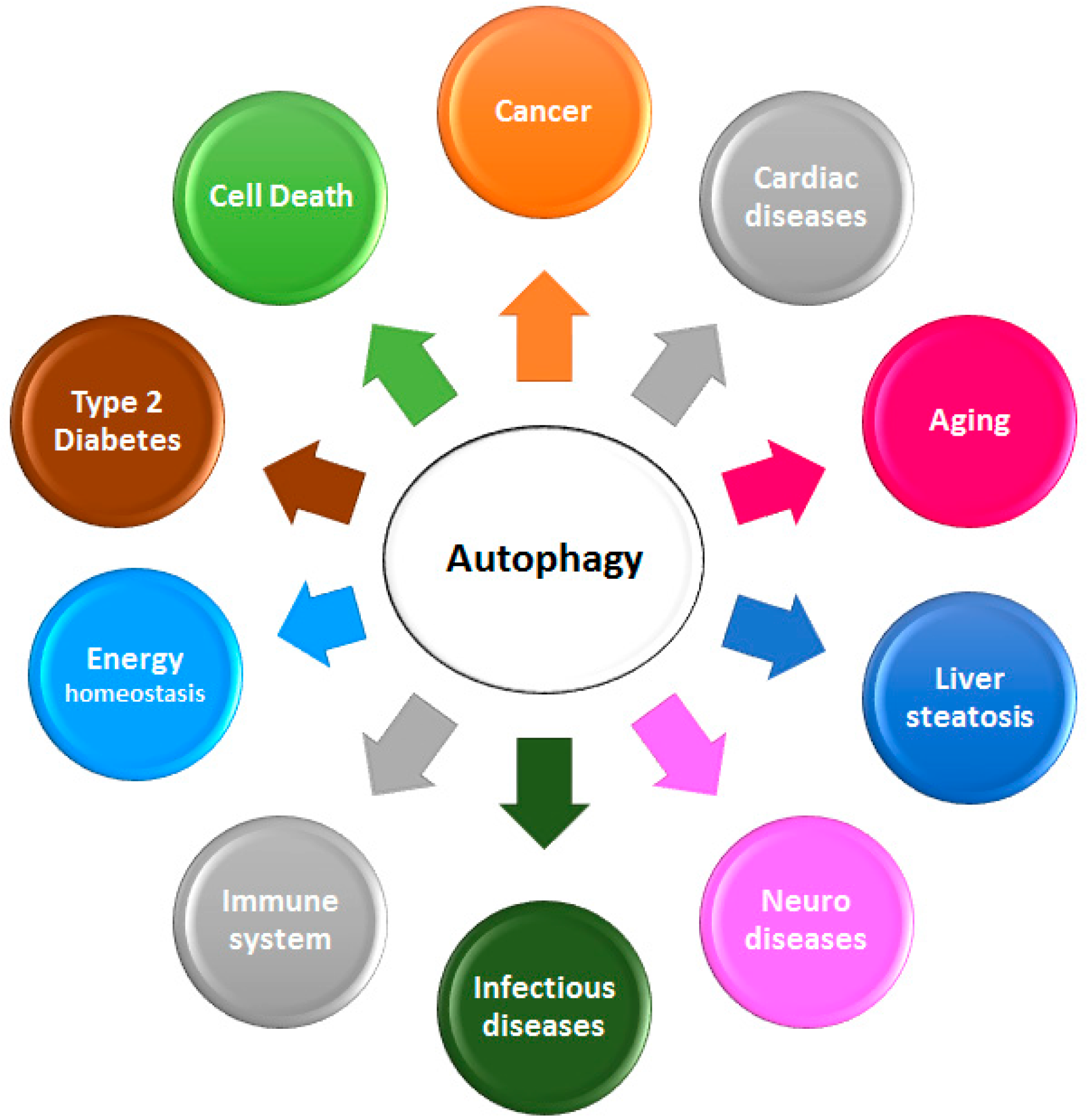 Autophagy is also considered to be a well-regulated cell survival mechanism. In fact, it plays a crucial role in the maintenance of normal human physiological processes, including cellular homeostasis, energetic balance, and development [19,20,21]. Autophagy has numerous pathological and physiological functions, and is implicated in pathological and physiological processes such as energy homeostasis, neurodegenerative diseases, type 2 diabetes, infectious diseases, cardiomyopathy, and diseases linked to aging and innate immune system, including cancer (Figure 2; [6,22,23,24,25]).