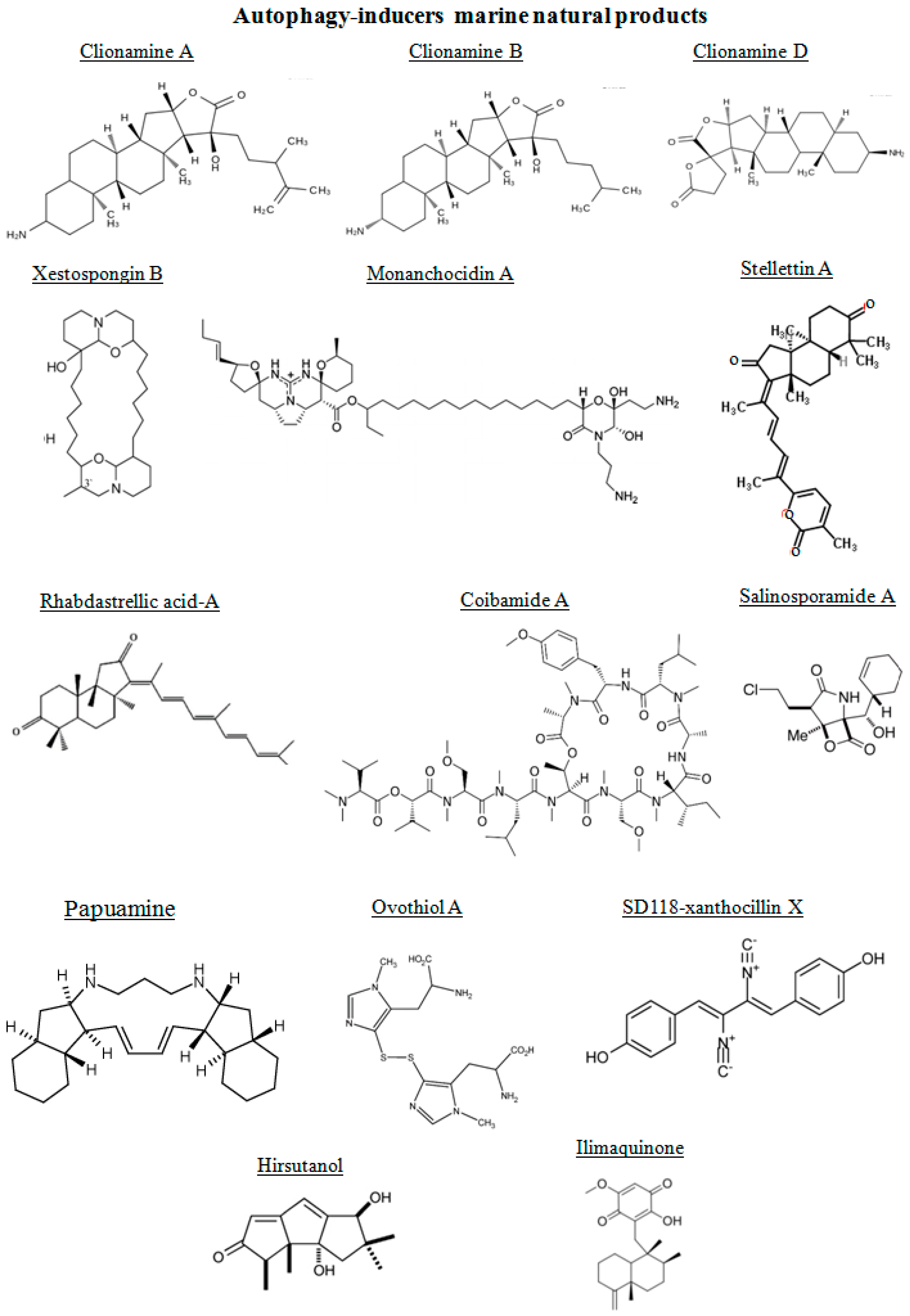 The chemical structures of the marine autophagy-inducers marine natural products are reported in the Figure 3. Four 3β-aminosteroids isolated from the marine sponge Cliona celata are involved in stimulating autophagy: clionamines A, B, C and D [85]. The clionamines contain structural features not previously encountered in naturally occurring steroids. They are characterized by a combination of an E-ring γ-lactone and C-20 hydroxylation as in all of the analogues and the spirobislactone side chain found in clionamine D. Lam et al. [86], prompted by the need for novel small molecule modulators of autophagy as chemical tools and drug leads, screened a library of marine organism crude extracts in a cell-based high content assay designed to find both stimulators and inhibitors of autophagy. They found a MeOH extract of the sponge C. celata (collected on the Wild Coast of South Africa) with promising autophagy stimulation. The amino steroids clionamines A to D have been revealed by assay-guided fractionation of the extract, revealing that they were responsible for the biological activity [87]. The major component in the extract was clionamine A. Clionamines A to D induced autophagosome accumulation measured by the formation of cytoplasmic punctate green fluorescent protein (GFP)-LC3, an autophagy marker. This effect was increased in medium lacking amino acids and serum. Moreover, clionamine A caused a decrease in the level of GFP-LC3 and an increase in GFP revealed by immunoblotting. These results indicated that the 1A/1B-light chain 3 (LC3) moiety of the fusion protein was degraded and that clionamine A stimulates autophagy, particularly under starvation conditions. In order to generate sufficient quantities of a natural clionamine or a more potent analogue for in vivo studies in animal models, Forestieri et al. [85] synthetized the clionamine B starting from the plant saponigen tigogenin. This synthetic clionamine B strongly stimulated autophagy in human estrogen-responsive breast cancer MCF7 cells.