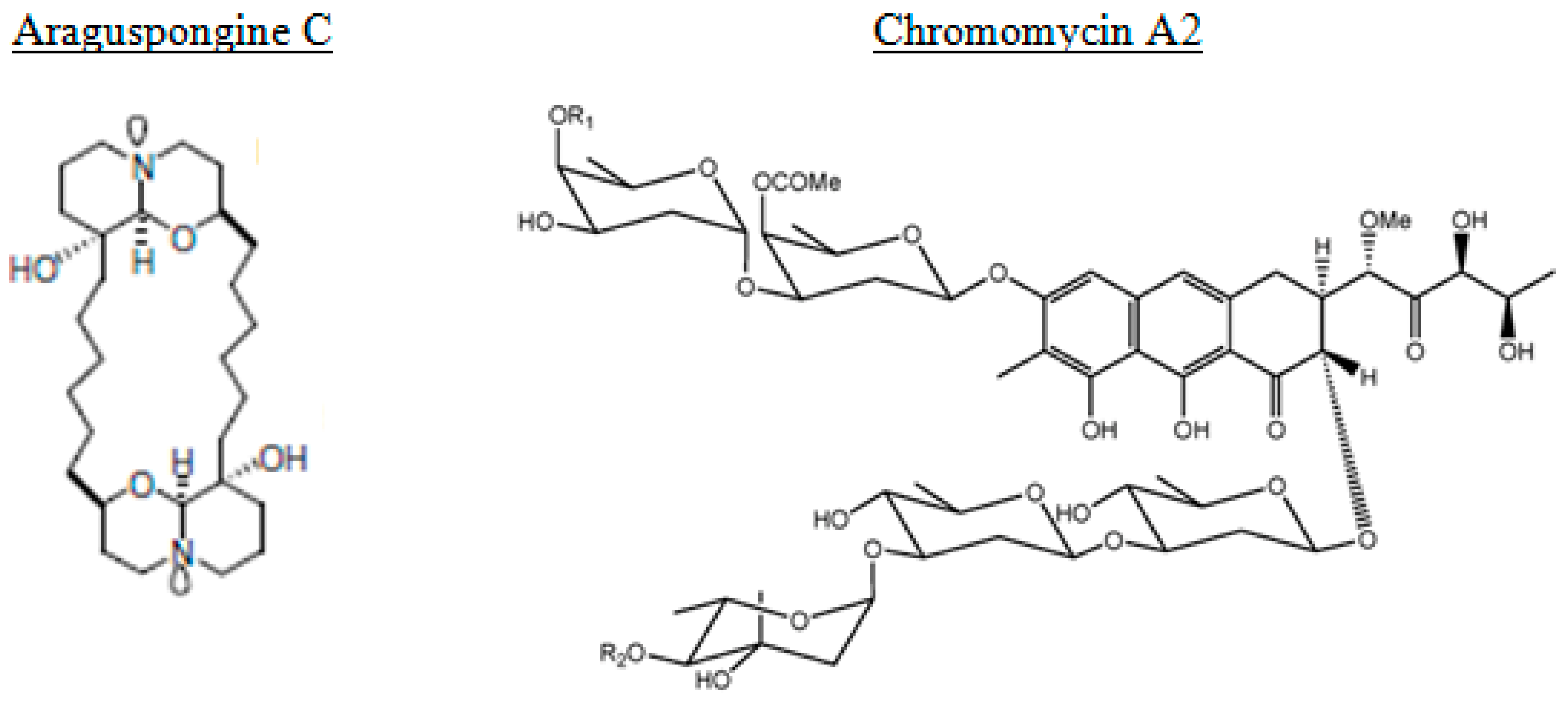 Chromomycin A2 is a glycosylated tricyclic polyketide member of the aureolic acid group of antitumor antibiotics. Is has been isolated from a strain of Streptomyces sp. recovered from sediment collected at Paracuru Beach, located on the west coast of Ceará State, on the northeastern region of Brazil [108]. Guimaraes et al. [108] reported on evidences that show the induction of autophagy in melanoma cells by chromomycin A2, a feature not yet described for this class of compounds.