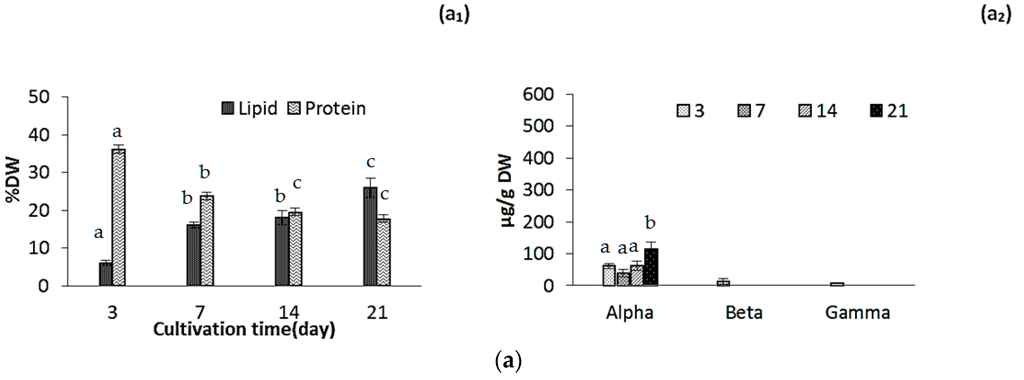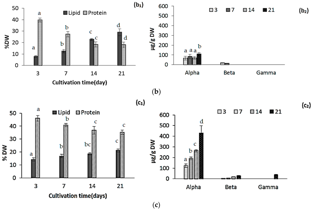 Lipid and protein content (a1,b1,c1) and tocopherol composition (a2,b2,c2) for (a) F/2 experiment; (b) ICW + F/2 experiment and (c) large scale experiment, respectively. The standard errors are presented as bars (n = 2), and different letters indicate significant differences (p < 0.05).