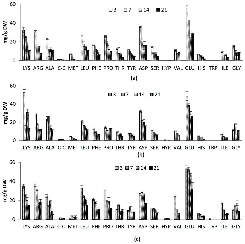 The amino-acid compositions of Nannochloropsis salina grown on two growth media is shown in Figure 3a,b. Nearly all of the amino acids were present in higher concentrations in ICW + F/2 cultivated samples. Concentration of amino acids decreased in the course of cultivation for both experiments. Aspartate, glutamate and arginine were generally found in the highest concentrations. Amino acid profiles are also similar to previous reports on Nannochloropsis genus and even microalgae species from different classes [38]. The similarity in the amino acid compositions suggests that the structure of microalgal protein may also be similar. This could indicate that many of the proteins performing specific functions and common to all species (e.g., C-fixation enzymes, membrane proteins associated with light-harvesting pigments) are highly conserved in their amino acid composition throughout the different species [38]. Notable difference was significantly higher amounts of lysine in F/2 cultivated microalgae samples at early stages of cultivation, while amounts of proline and glutamine were higher in ICW + F/2 cultivated samples. Ammonia is generally thought to directly assimilate into the amino acid glutamine [32], which can explain higher concentrations of glutamine in ICW + F/2 cultivated samples (58 mg/g vs. 48 mg/g). In general total amino acid content was higher in ICW + F/2 cultivated samples (Figure 3d), which could be contributed to higher amounts of nitrogen in growth media.