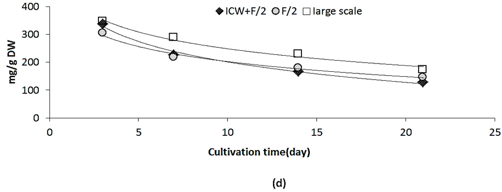Variations in amino acid composition of large scale cultivated N. salina are shown in Figure 3c. To our knowledge not the same study concerning the variations in amino acid composition in the Nannochloropsis sp. cultivated in large scale. Glutamate was rated as the main amino acid, while concentration of lysine, arginine, and leucine were nearly the same. It could be concluded that the variations in amino acids in large scale followed the variation in protein contents in laboratory scale experiments. The presented amino acid composition for large scale cultivated Nannochloropsis salina was an ideal composition for aquaculture feed formulas [38]. Total amino acid content also decreased during the cultivation with a gentler slope than ICW + F/2 laboratory scale experiment (Figure 3d).