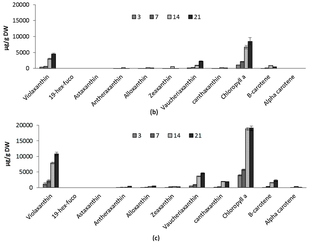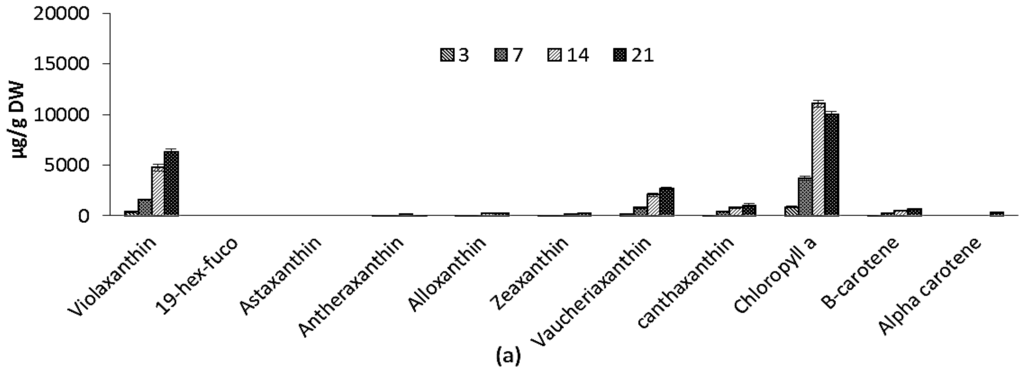 Pigment composition of large scale cultivated Nannochloropsis salina resembled the results, which were discussed previously for laboratory scale cultivated species. Variations in pigment composition are shown in Figure 4c. Chlorophyll content increased during the course of cultivation from 3944 ± 200 µg/g to 19,020 ± 720 µg/g. During 21 days of experiment, total carotenoids increased from 2038 ± 48 µg/g to 20,797 ± 1048 µg/g. Amounts of beta-carotene increased significantly from 26.9 ± 48 µg/g to 2284 ± 234 µg/g. Other carotenoids including vaucheriaxanthin, canthaxanthin, and zeaxanthin also increased during the cultivation time. Free to esterified vaucheriaxanthin ratio was 1:4.2. Car/Chl increased during the cultivation from 0.5 to 1.1. This finding can be explained by environmental stresses such as low temperature and photoperiod, which may influence the light harvesting pigments, i.e., mainly violaxanthin in Nannochloropsis sp. [15,36].