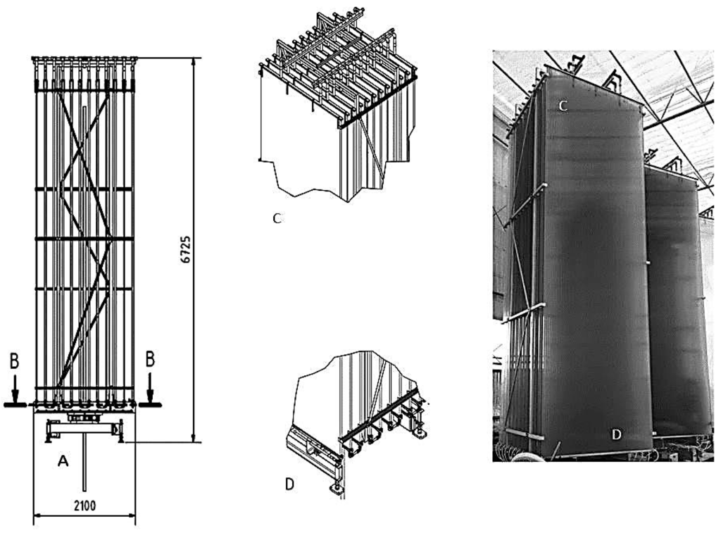 Schematic of flat panel photo-bioreactor which was used for the large scale cultivation experiment. (A) Rotating system; (B) ground level; (C) top part; (D) bottom part. Every unit includes 12 sheets. Sheet dimensions: width 2100 mm; height 5600 mm and depth 32 mm.