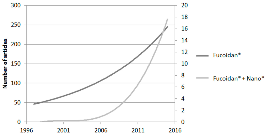 Evolution of published articles reporting fucoidans (from Web of Science). Left axis: number of articles for “Fucoidan*”, right axis: number of articles for “Fucoidan* + Nano*”.