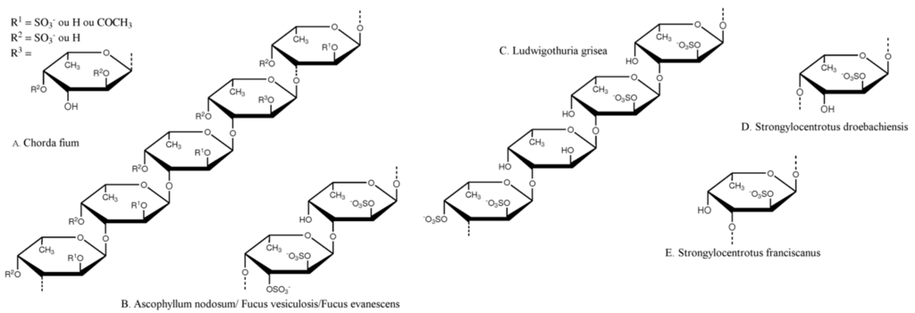 Repeating chemical structures of some fucoidans from brown algae (A) Chorda filum [28]; (B) Ascophyllum nodosum, Fucus vesiculosus, and Fucus evanescens [22,23,31] and from marine invertebrates: sea cucumber (Holothuriodea) (C) Ludwigothuria grisea [29]; (D) Strongylocentrotus droebachiensis [17], and (E) Strongylocentrotus franciscanus [30].