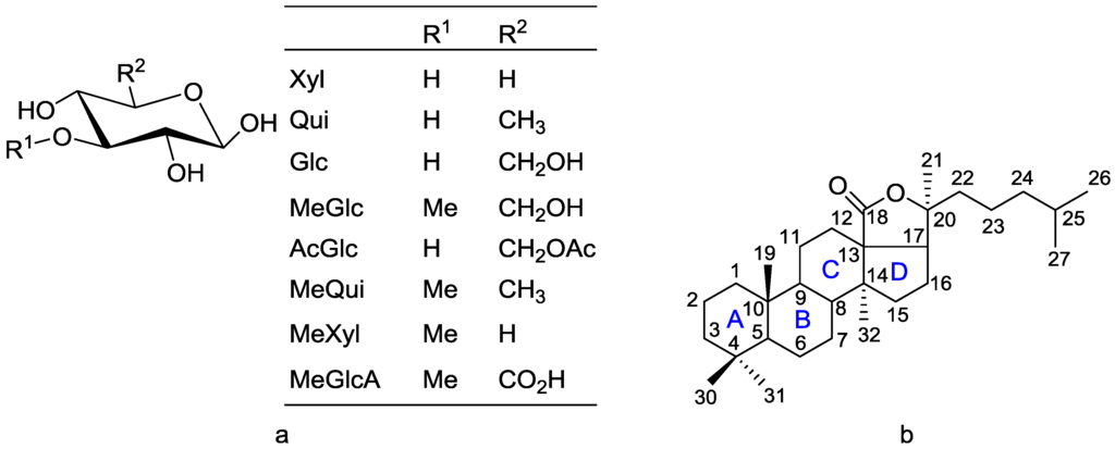 Saponins are generally divided into three main groups in accordance with their aglycone (genin) structure: triterpenoidic, steroidal and steroid alkaloid glycosides [22]. Triterpenoid saponins have aglycones that consist of 30 carbons, whereas steroidal saponins possess aglycones with 27 carbons, which are rare in nature [22]. Sea cucumber saponins, commonly referred to as holothurins, are usually triterpene glycosides containing a holostane structure, derived from lanostane, which the majority belongs to rather than nonholostane [19,21,26]. The former is comprised of a lanostane-3β-ol type aglycone containing a γ-18(20)-lactone in the D-ring of tetracyclic triterpene (3β,20S-dihydroxy-5α-lanostano-18,20-lactone) structural characteristic [27,28] and can contain a shortened side (aliphatic) chain, and a carbohydrate moiety consisting of up to six monosaccharide units covalently connected to C-3 of the aglycone (cyclic system) [19,29,30,31,32]. The sugar moieties mainly consist of d-xylose (Xyl), d-quinovose (Qui), 3-O-methyl-d-glucose (MeGlc), 3-O-methyl-d-xylose (MeXyl) and d-glucose (Glc), and sometimes 3-O-methyl-d-quinovose (MeQui), 3-O-methyl-d-glucuronic acid (MeGlcA) and 6-O-acetyl-d-glucose (AcGlc) [32]. The monosaccharide unit which is linked to the C-3 of aglycone is always Xyl, whereas MeGlc and/or MeXyl are always the terminal sugars. The monosaccharaide residues bearing 3-O-methyl groups are always terminal ones. The great majority of saponins have Qui or Glc as the second unit in their carbohydrate chain. Apparently, 3-O-methlylation of the monosaccharide units is a termination signal, preventing the further elongation of a carbohydrate moiety in sea cucumber glycosides. The basic structure of monosaccharides (a) and the holostane type aglycone (b), which is a characteristic aglycone moiety for sea cucumber saponins, are shown in Figure 1.