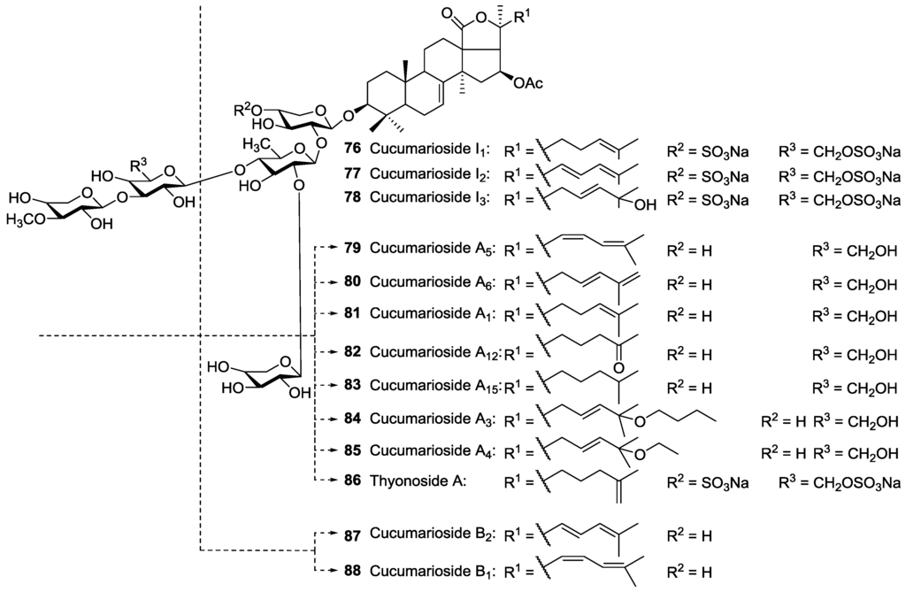 To date, two types of glycosides having a diene-system in the side chain of their aglycones have been reported; glycosides bearing the 22E,24-diene system from E. fraudatrix and E. pseudoquinquesemita and glycosides having the 22Z,24-diene system from E. fraudatrix and Mensamaria intercedens. However, Cucumarioside A6 80 was reported to contain a 23E,25-diene system which is an uncommon structure for sea cucumber glycosides.