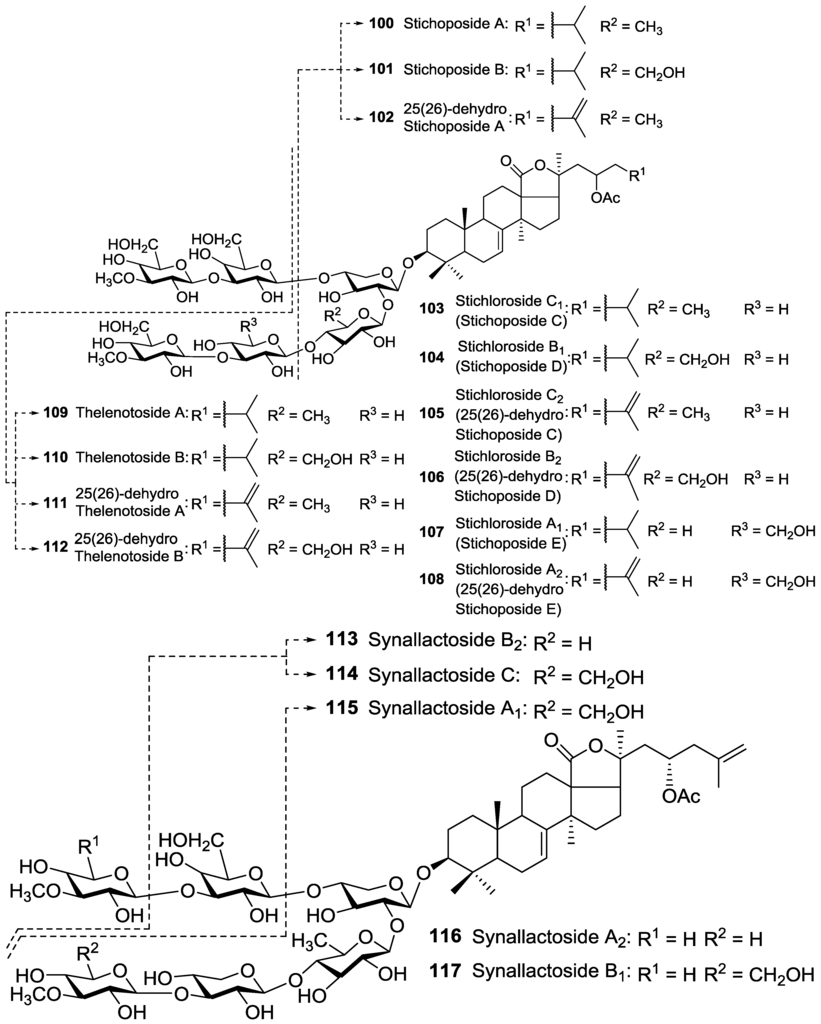 In general, the structure of the carbohydrate chain is also a characteristic which defines the biological activity of these glycosides. For instance, it has been reported that Stichoposide A 100 (a disaccharide glycoside) and Stichoposide E 107 (a hexasaccharide glycoside having a Xyl as the second sugar moiety) showed lower membranotropic activity than other stichoposides [92]. The presence of a sulfate group can also influence the biological activity of triterpene glycosides considerably [27]. The presence of a sulfate group attached to the first Xyl of a linear tetrasaccharide residue of triterpene glycosides increases their activity. However, the activity of sulfated glycosides will influence with the type, sequence and order of the other monosaccharides in their sugar resides as well as the position of sulfate group. Stichoposide C (Stichloroside C1) 103 is a quinovose-containing hexaosides at its second position. It has been described that Stichoposide C stimulated apoptosis of human leukemia and colorectal cancer cells via the activation of both intrinsic and extrinsic pathways [14]. Apoptosis was shown to be induced by this compound in mouse CT-26 subcutaneous tumor and HL-60 leukemia cells in a dose-dependent manner and resulted in the activation of Fas (CD95) and caspase-8, cleavage of Bid, mitochondrial damage, and activation of caspase-3. Stichoposide C 103 was also reported to reduce tumor growth of HL-60 xenograft and CT-26 subcutaneous tumors and enhance ceramide generation in vivo through activation of acid and neutral types of sphingomyelinases (SMase) in response to apoptotic stimuli. It should be noted that in all types of cancer cells, anticancer substances enhance ceramide levels to variable degrees [135]. Apparently, Stichoposide C 103 targets SMase which leads to an increase in ceramide and apoptosis.