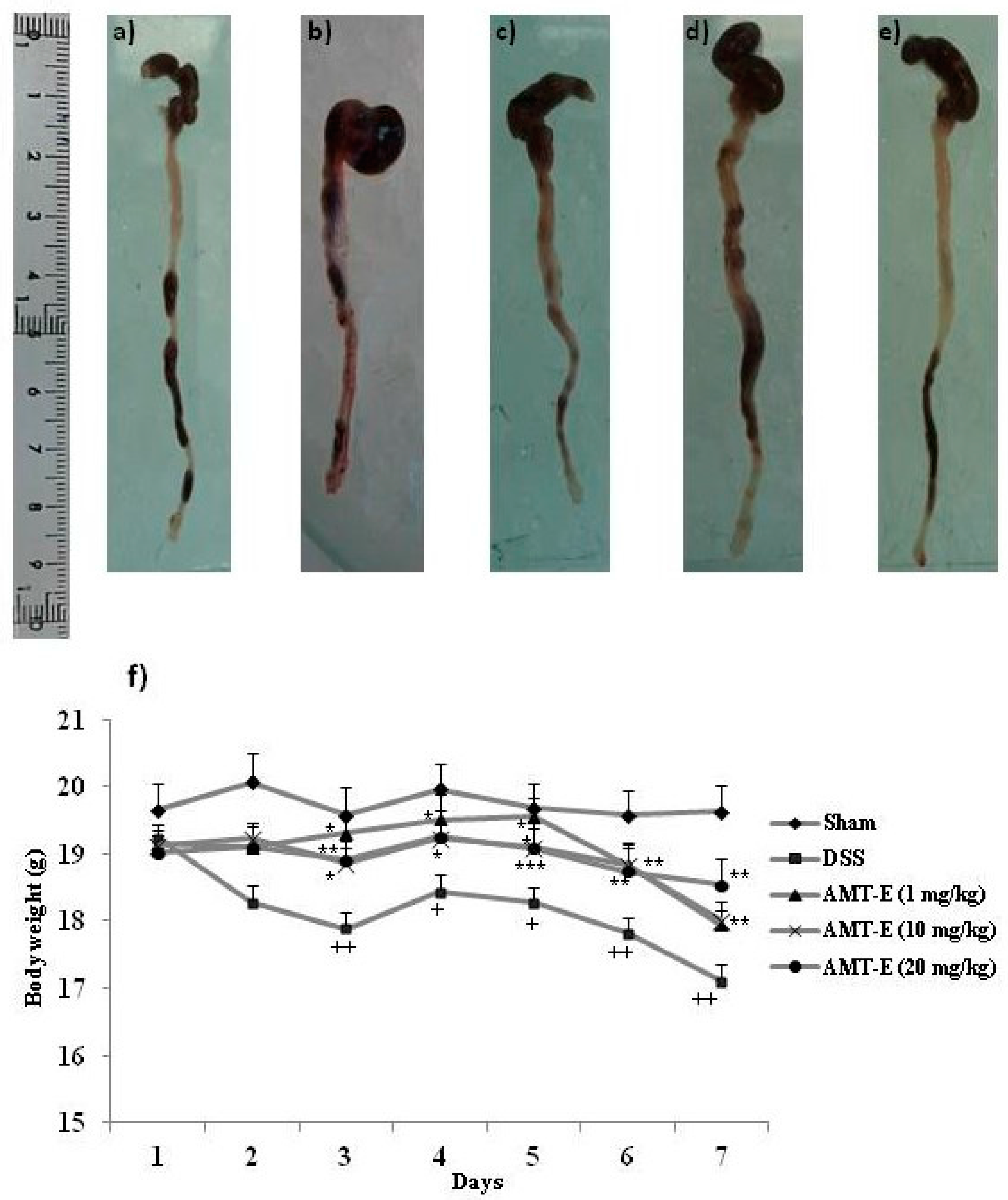 To determine the potential in vivo anti-inflammatory effect of AMT-E, we tested this compound using the DSS model of acute intestinal inflammation. It is worth noting that neither DSS nor the different AMT-E treatments caused changes in the relative weights and appearance of organs such as the liver, kidneys, and heart, which are highly susceptible to drug toxicity. However, as shown in Table 1, mice that were treated with DSS showed a marked colon shortening in relation to Sham animals (p < 0.001) (Table 1 and Figure 2a,b). This effect is indicative of the presence of inflammation. AMT-E treatments modified this effect and the highest dose of the compound (20 mg/kg) was able to significantly prevent DSS-induced colon shortening (p < 0.01) (Table 1 and Figure 2e). Moreover, mice that were treated with DSS showed a progressive loss of body weight, with fluctuations typical of this type of experiment, during the 7 days that the study lasted (Figure 2f). Mice treated with AMT-E were protected from this marked loss of body weight, with significant response from day three to the end, and for the three doses tested.